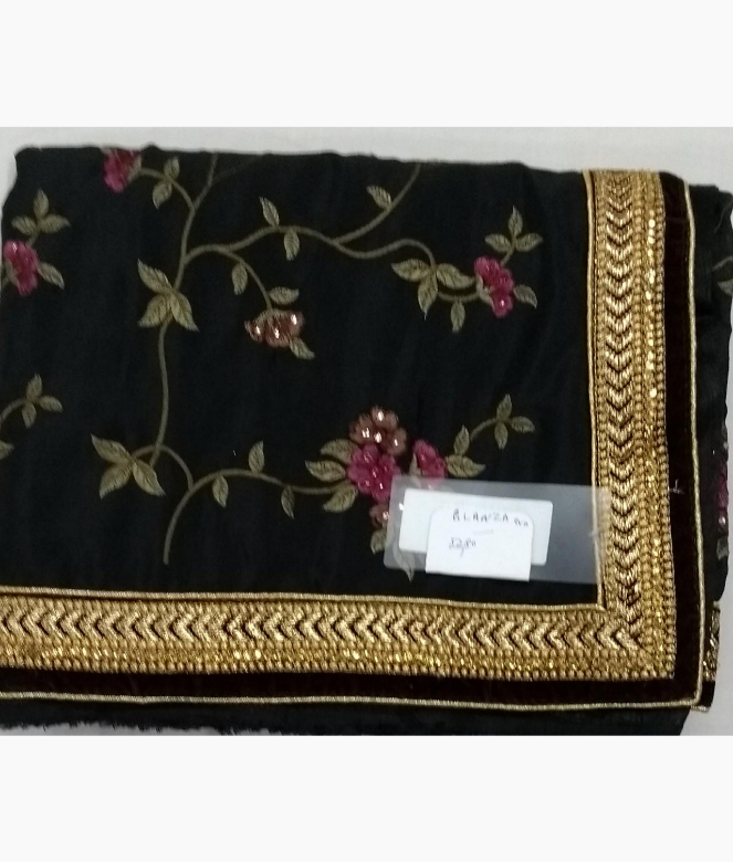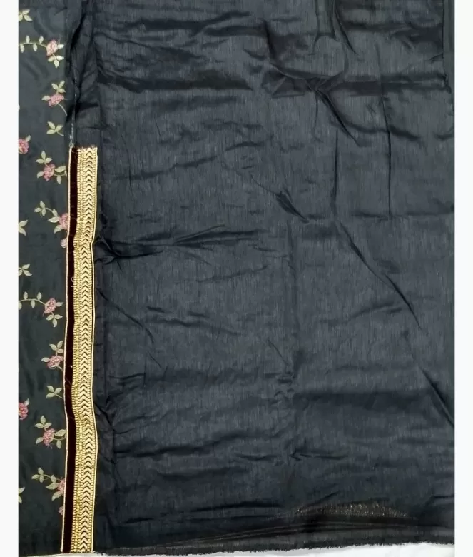 Sequence work and jari with velvet strips on border of saree. Border patti of saree of same saree matching is on blouse patti with fabric of khadi silk.
