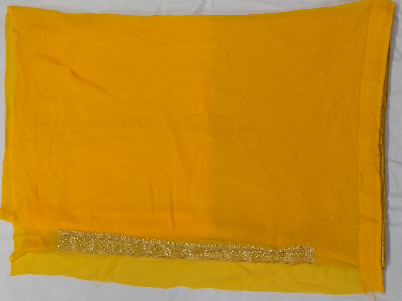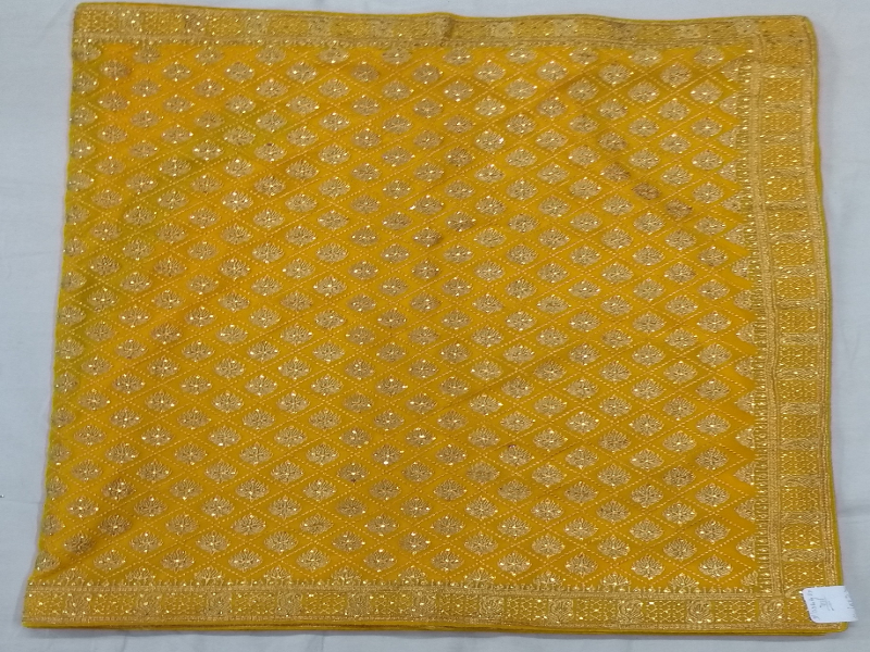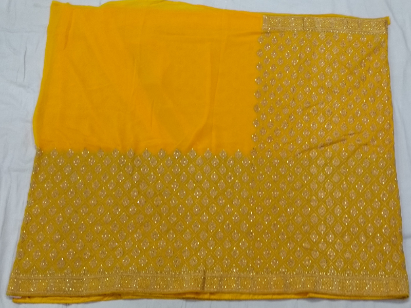 Saree has an elegant design with heavy golden thread embroidery mix with beats work on saree. Heavy border which suits for bride. Blouse has border work which is shown on sleeves | Length - 6.30 Mtr | Color - Yellow
