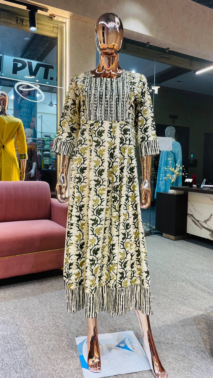 A rayon printed embroidered gown is an elegant and stylish garment that combines the softness and drape of rayon fabric with intricate embroidery and beautiful prints.