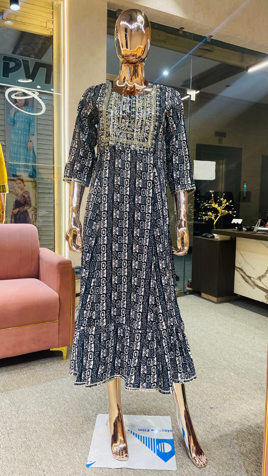 A rayon printed embroidered gown is an elegant and stylish garment that combines the softness and drape of rayon fabric with intricate embroidery and beautiful prints.