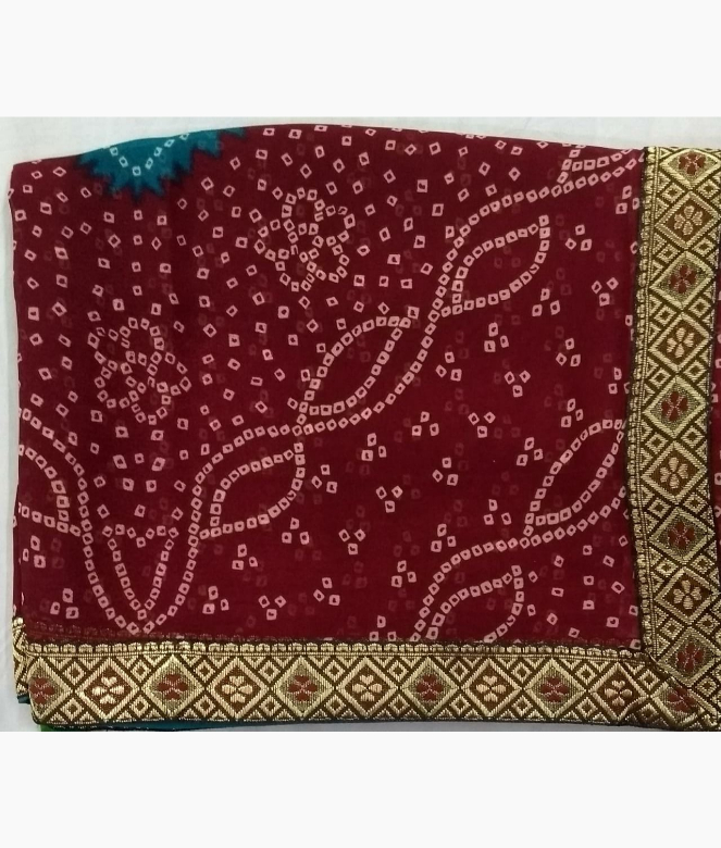 Two latkans on corner of the pallu of the saree. Matching same border of saree is on blouse patti for neck and sleeves with printed blouse.