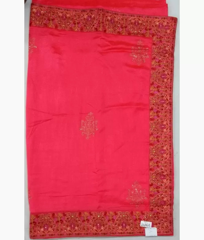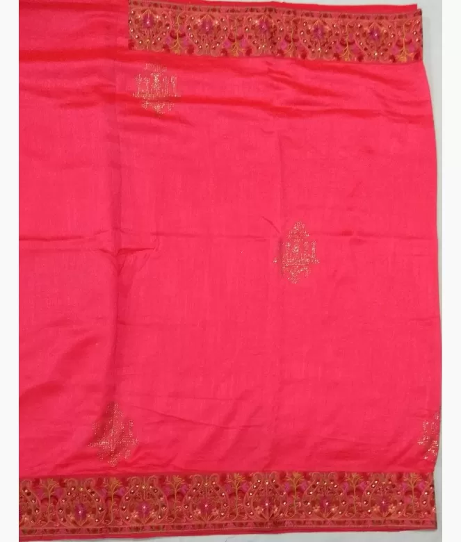 Designer pattern work on saree. Big golden colour swarovski boota on corner and pallu of saree.