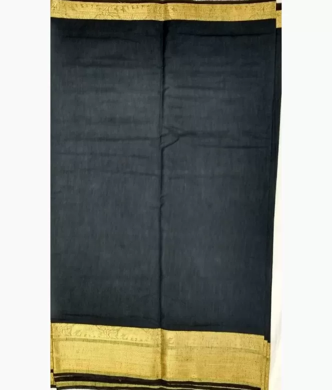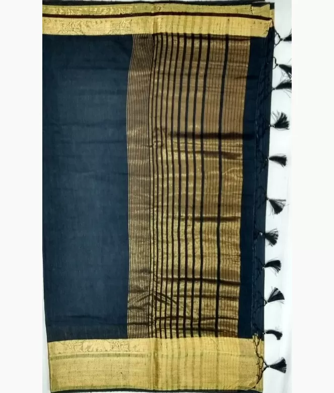 Border is of double golden colour zari flower weaving design and zari patta on saree. Matching same border of saree is on blouse for neck and sleeves.