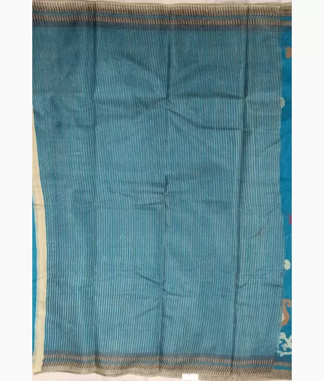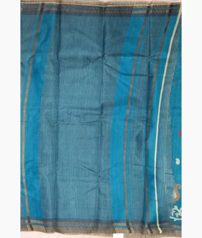 Border is of big ambi in multi colour thread jhardi in lehariya design in thread work on saree panel. Blouse is of contrast colour strips weaving design for all over.