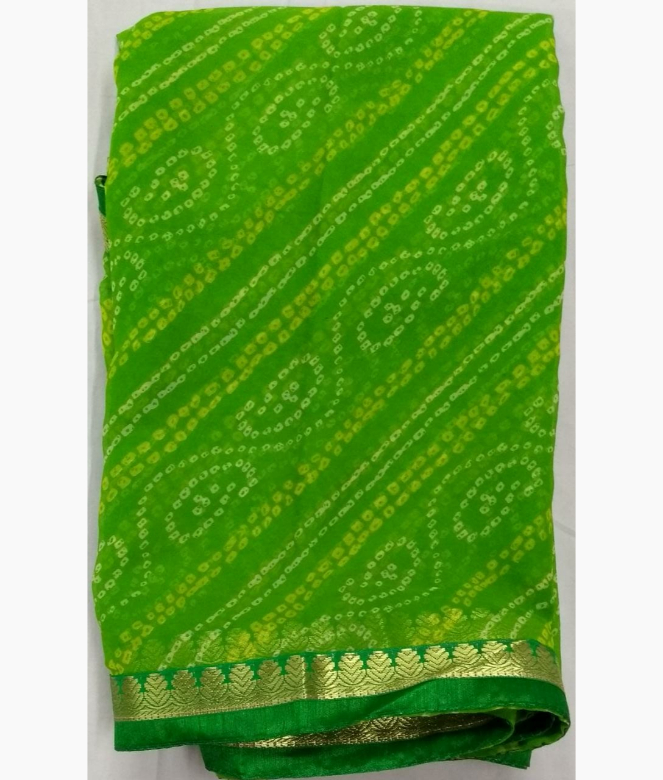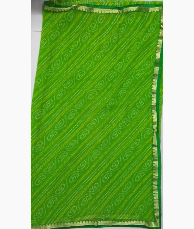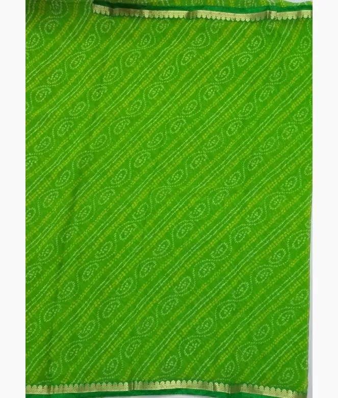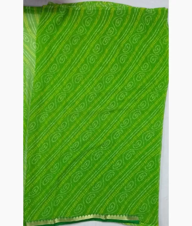 All over Jaipuri bhandhej green colour saree with golden colour zari design border patti and green colour piping on saree.