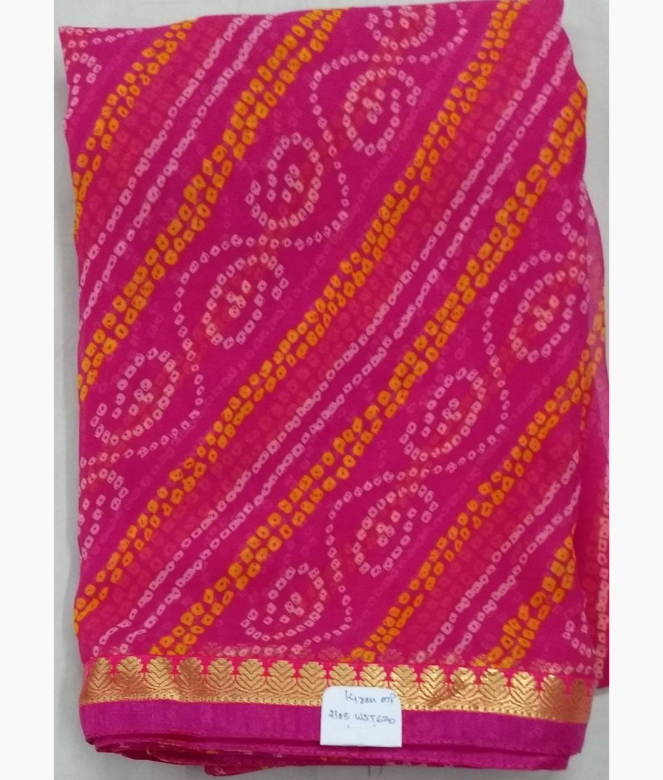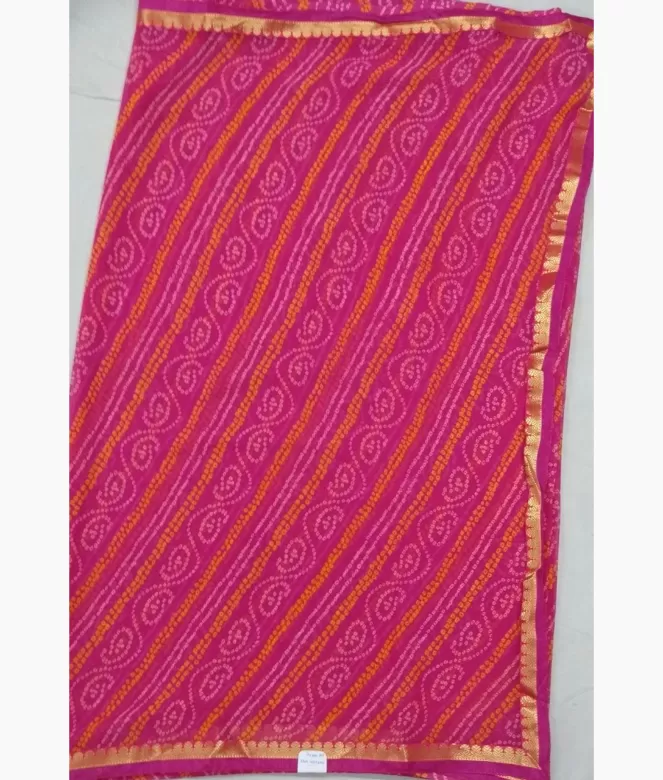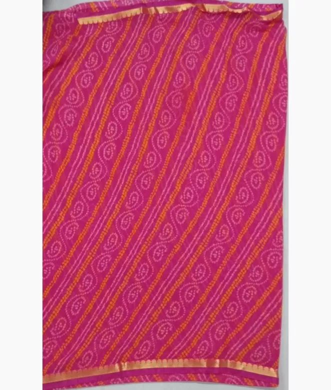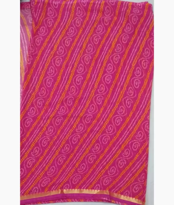 All over Jaipuri bhandhej pink colour saree with golden colour zari design border patti and pink colour piping on saree.