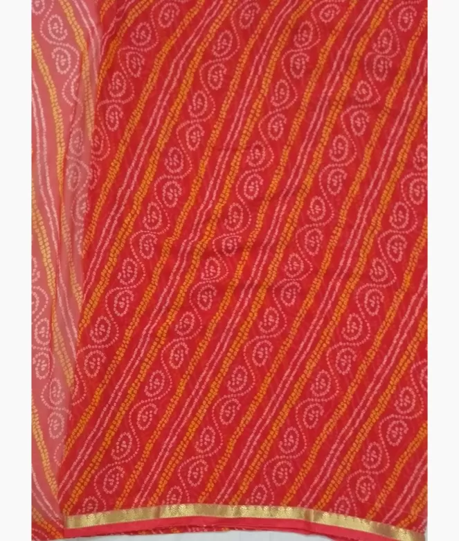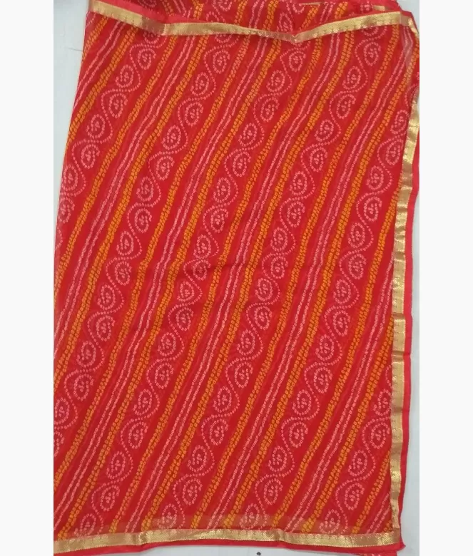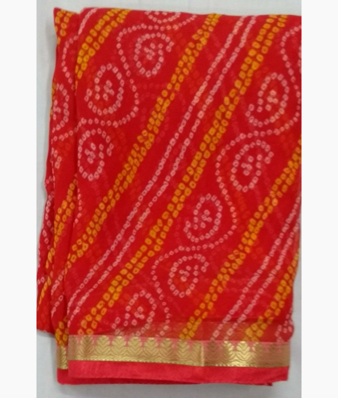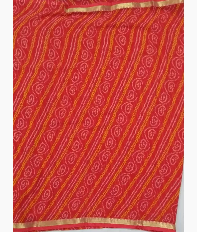 All over red colour Jaipuri bhandhej print saree with golden colour zari design border patti and red colour piping on saree.