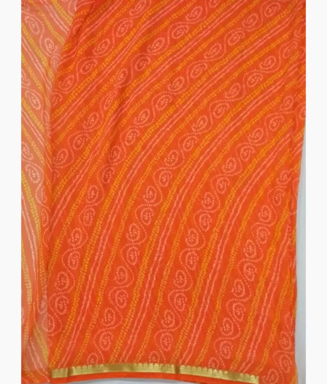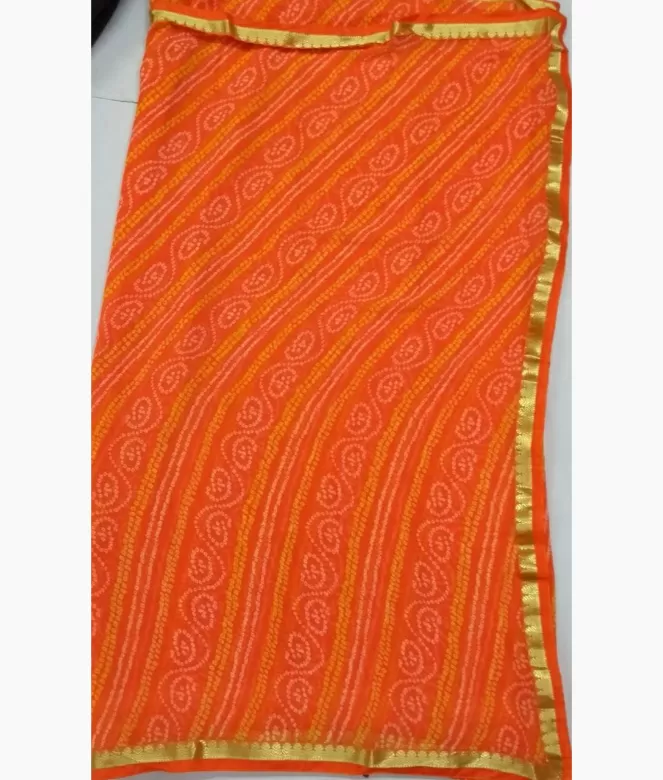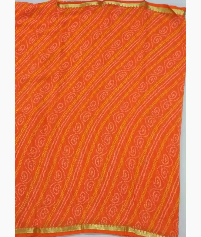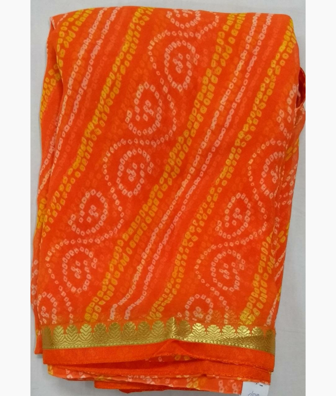 All over orange colour Jaipuri bhandhej print saree with golden colour zari design border patti and orange colour piping on saree.