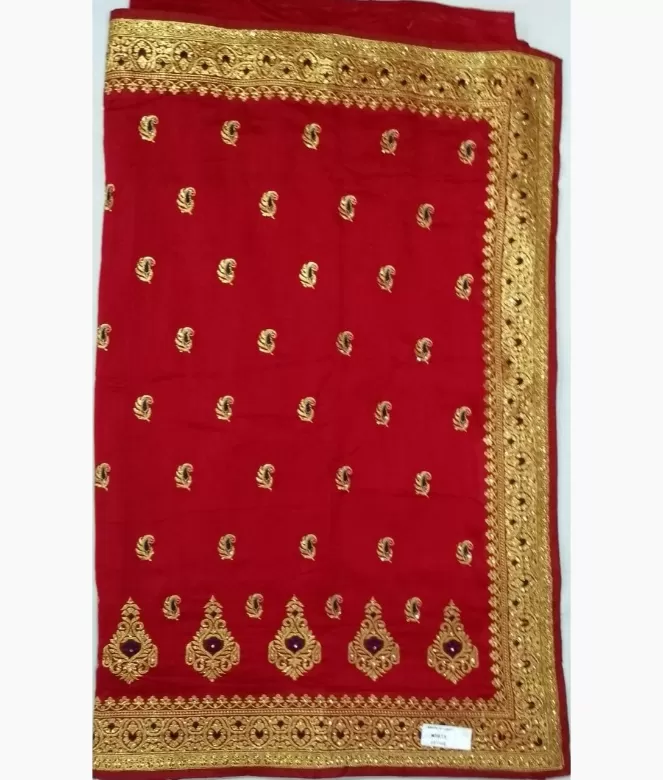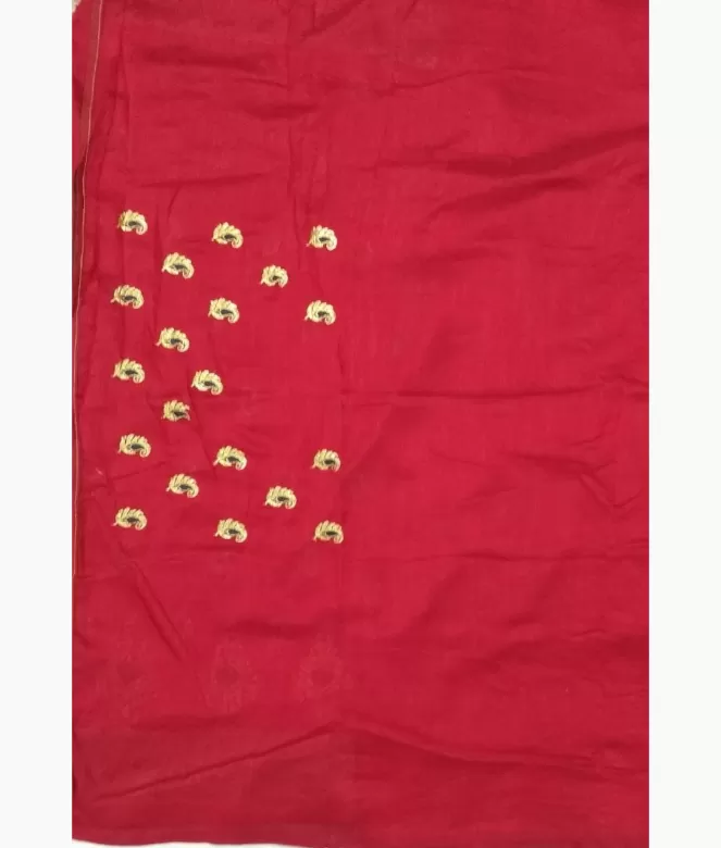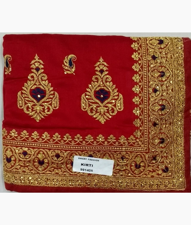 Big ambi in golden colour zari with blue colour on panel of saree. Sequence work on boota all over saree. Border is of flower design with golden colour zari, thread and sequence work on saree. Matching work of saree is on blouse for neck only.