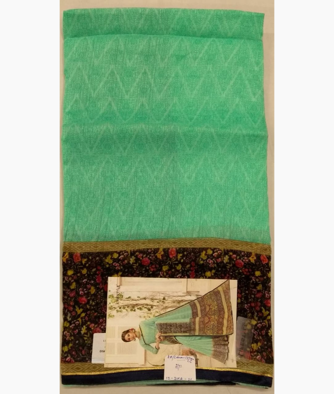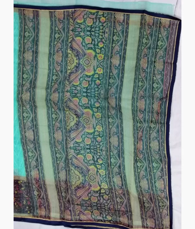 border is of multi colour flower and leaf design printing with piping. Matching same colour and fabric is on plain blouse.