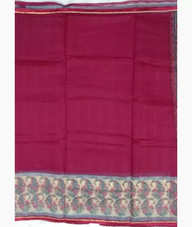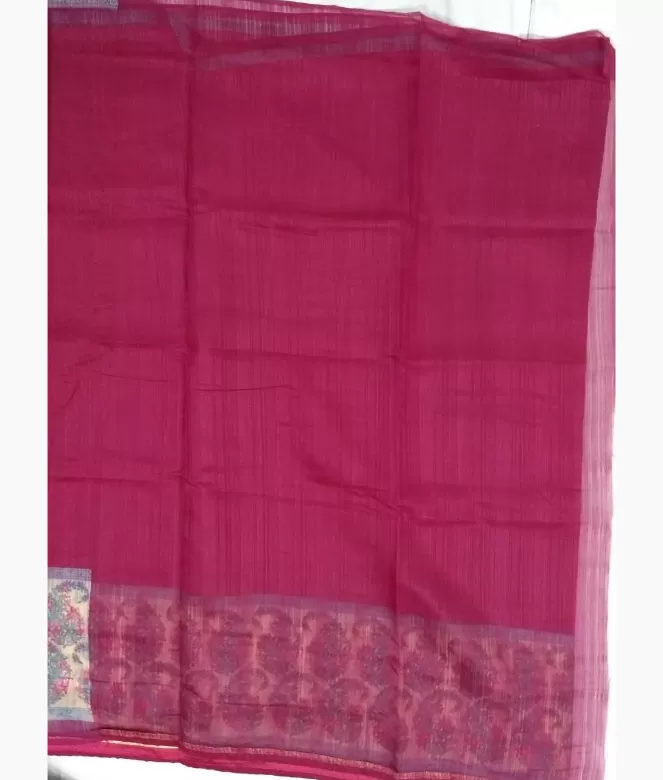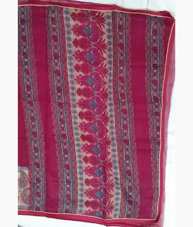 Surrounding same colour piping with golden colour zari on all over saree. Border is of contrast colour with multi colour flower ambi design. Matching same colour and fabric is of plain blouse.