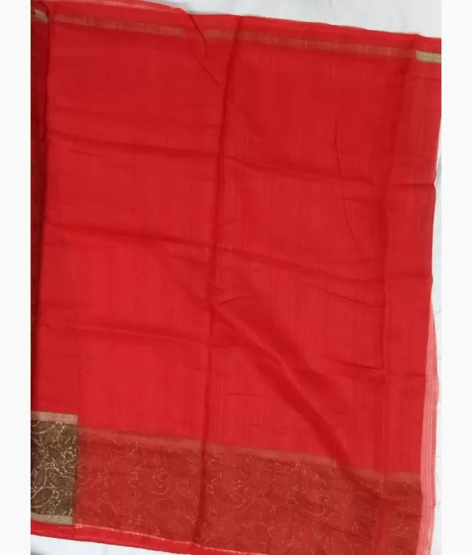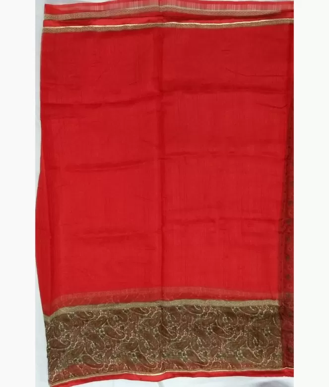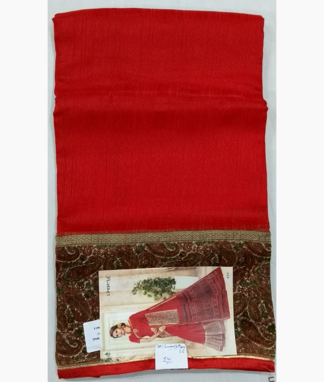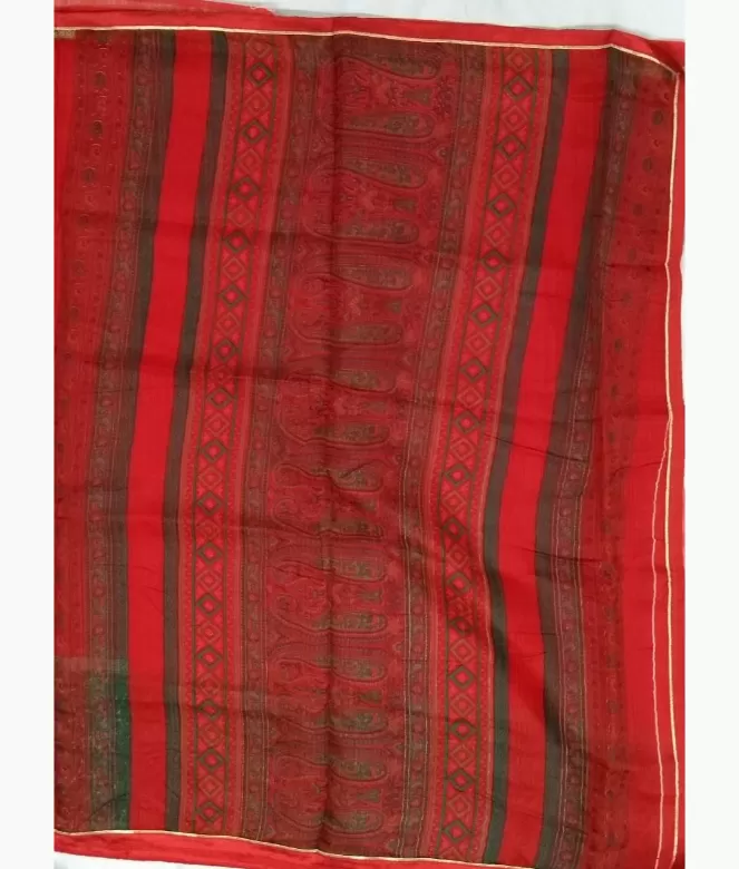 Border is of contrast colour ambi design in printing. Surrounding piping with golden colour patti in zari on all over saree. Matching same colour and fabric is of plain blouse.
