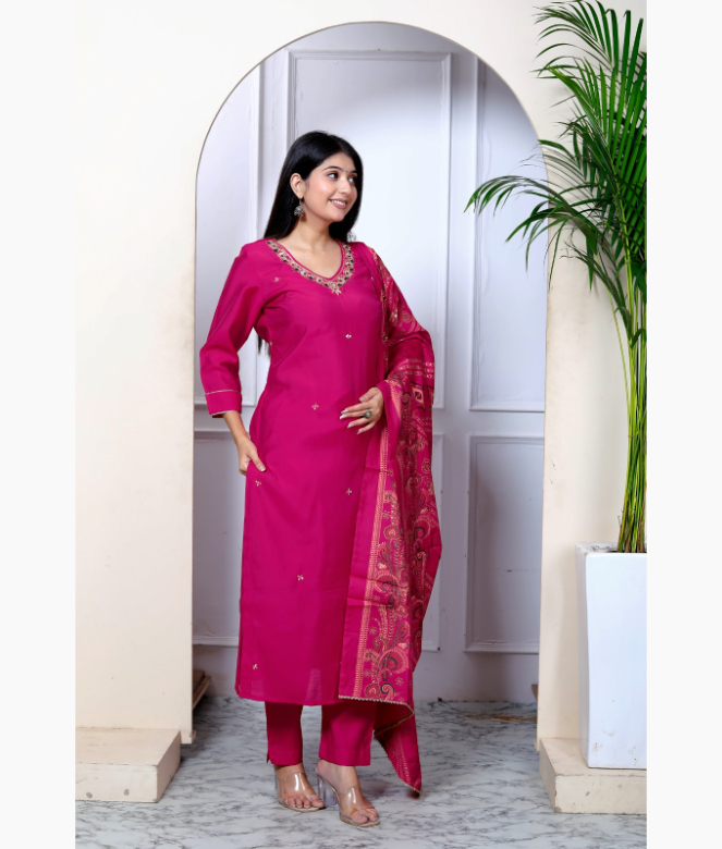 Radiate joy with the Lovely Yellow Cotton Stitched Straight Suit Set, designed for everyday elegance. Crafted from soft, breathable cotton, this vibrant yellow ensemble is perfect for casual outings or work. The straight-cut design offers a flattering fit, making it easy to wear throughout the day. Pair it with your favorite accessories to elevate your look, whether you’re heading to lunch with friends or a relaxed evening gathering. This suit set combines comfort and style effortlessly, making it a must-have addition to your wardrobe!