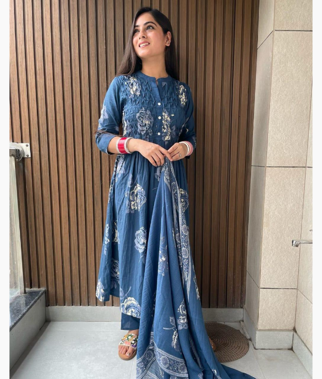 Home  /  Suit & Dress Material  /  Daily Wear Suits / Lovely Stitched Floral Print A-Line Blue Suit Set