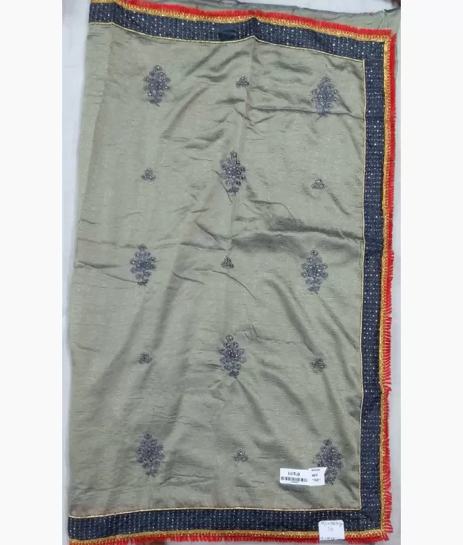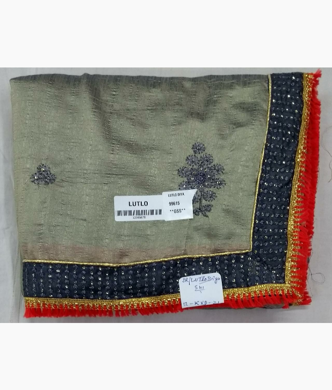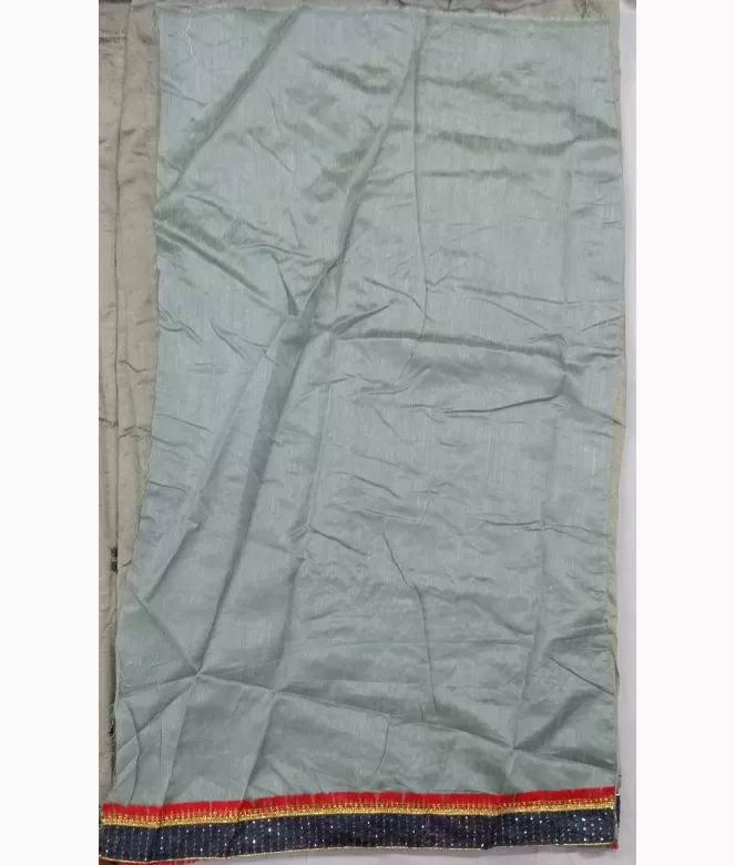 Sequence work on booty in silver colour. Heavy pallu with jhalar and zari work. Border is of double design of contrast colour patti with heavy sequence work with grey patti and red colour jhalar and golden colour zari work. Matching same border of saree is on blouse for neck and sleeves.