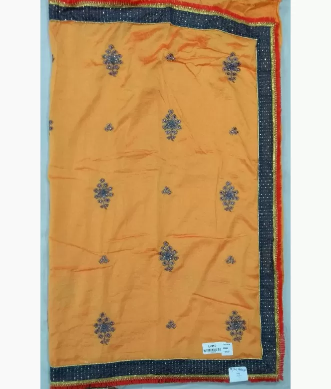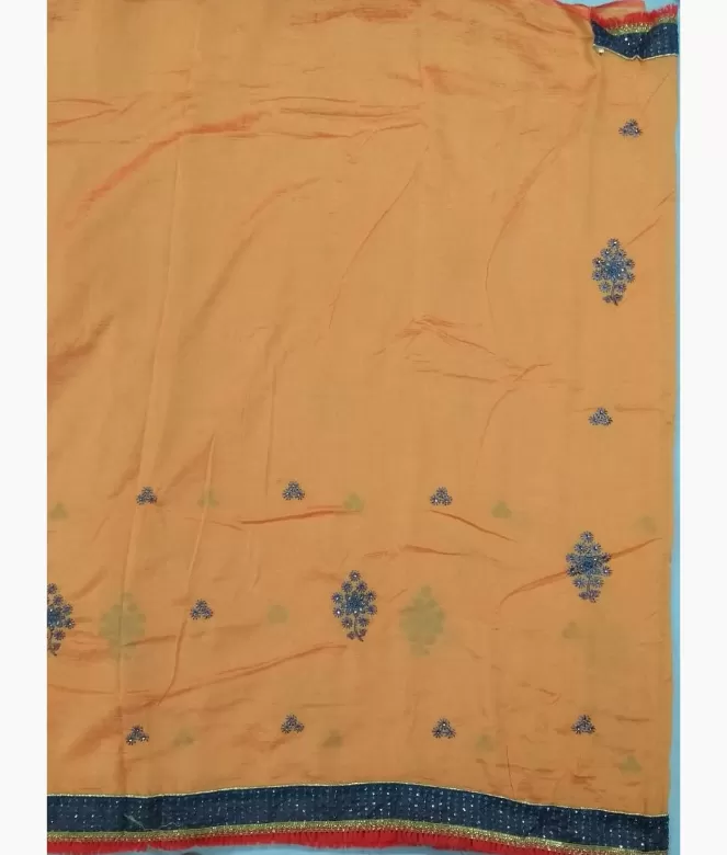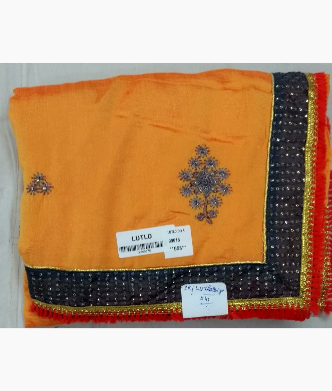 Sequence work on booty in silver colour. Heavy pallu with jhalar and zari work. Border is of double design of contrast colour patti with heavy sequence work with grey patti and red colour jhalar and golden colour zari work. Matching same border of saree is on blouse for neck and sleeves.
