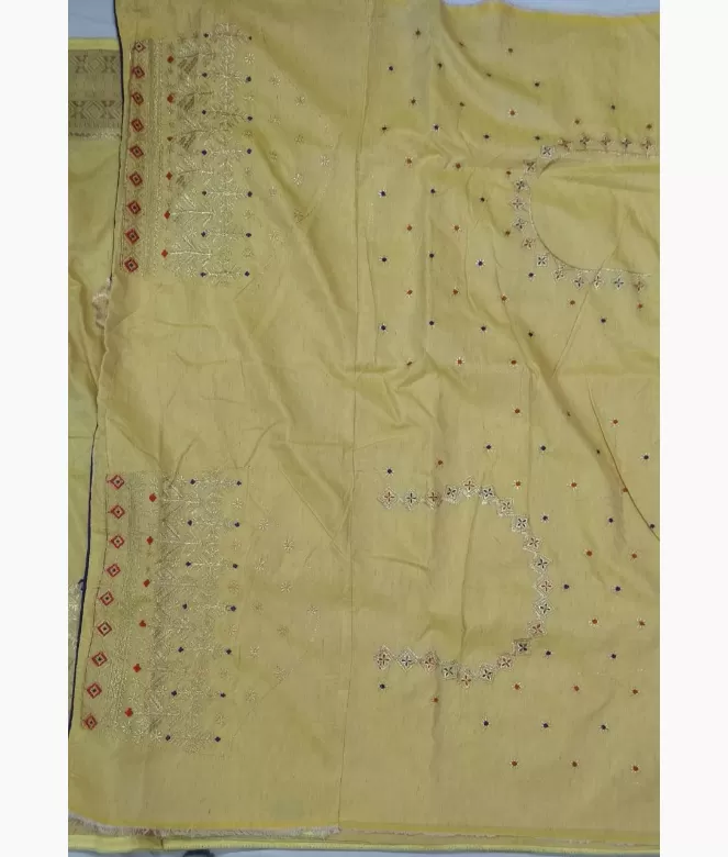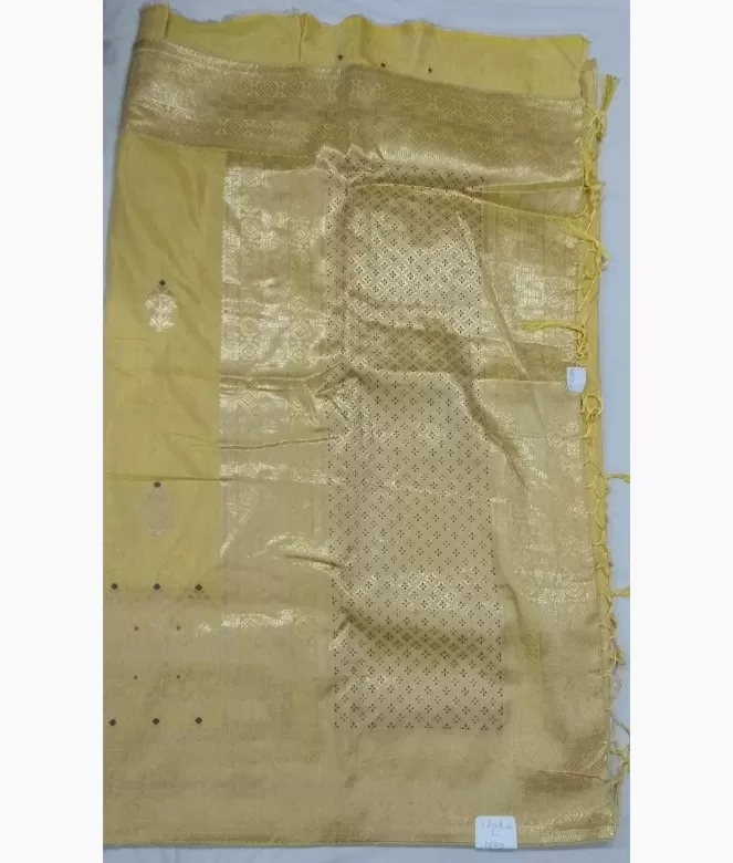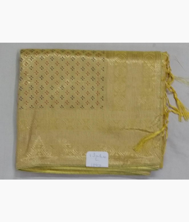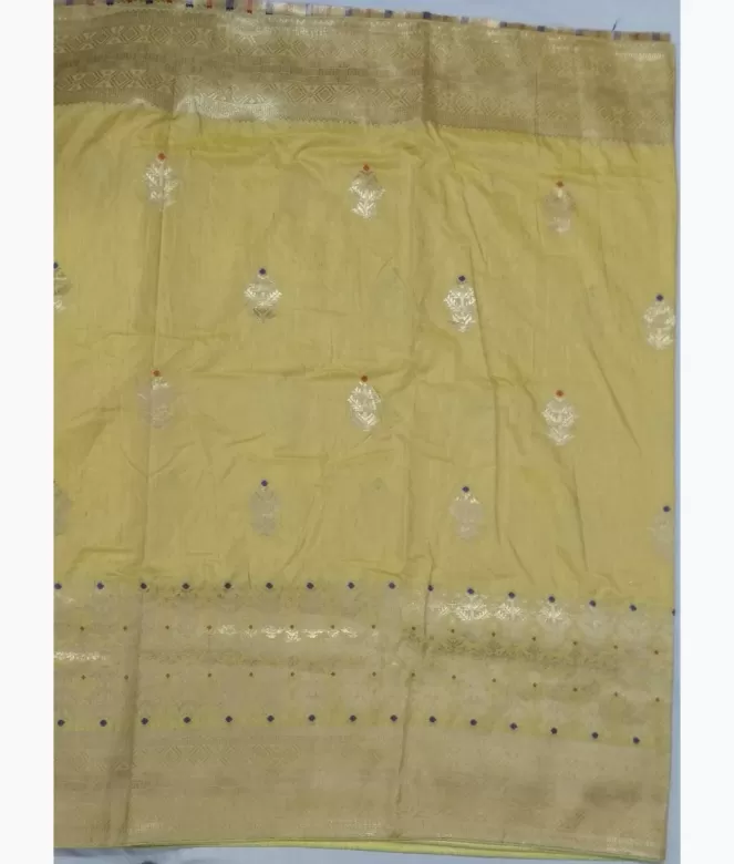 Heavy big golden colour zari weaving with multi colour thread work on border. Matching same work of saree is on blouse for back, neck and sleeves.