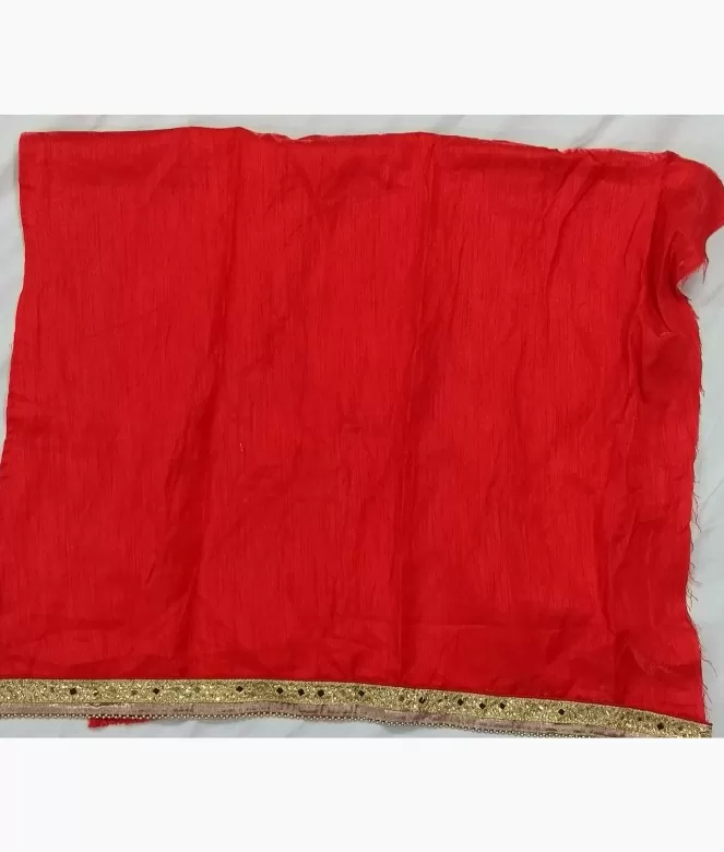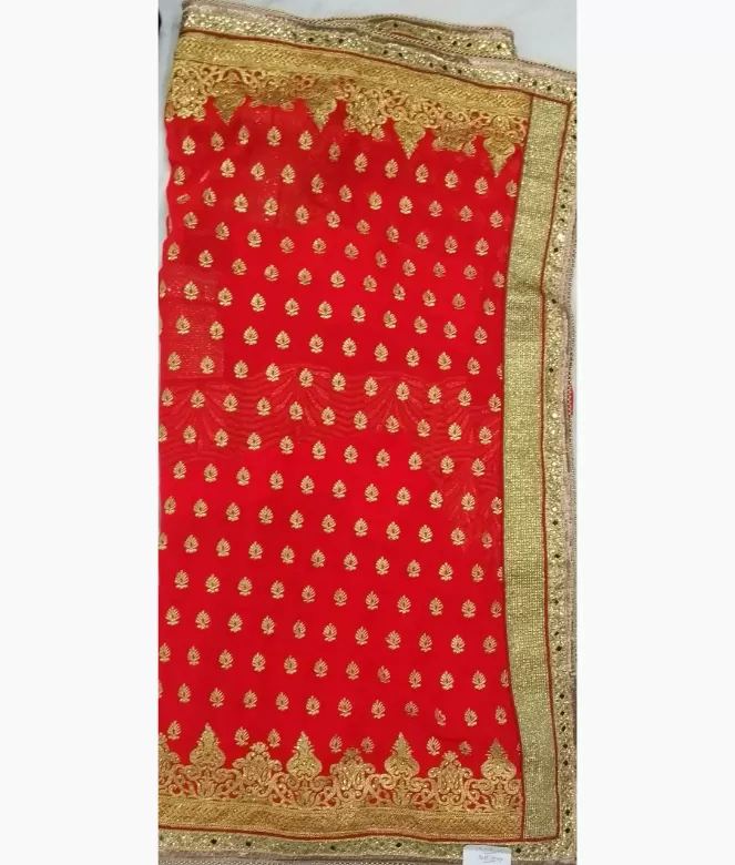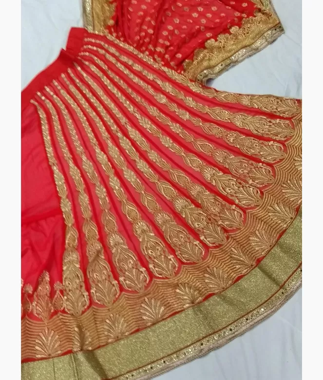 Big design in antique and golden zari thread work on panel lehenga design on saree. Border is of golden colour zari and red colour piping with mirror and sequence work with golden moti latkan on border. Matching same golden border of saree is on blouse for neck and sleeves.