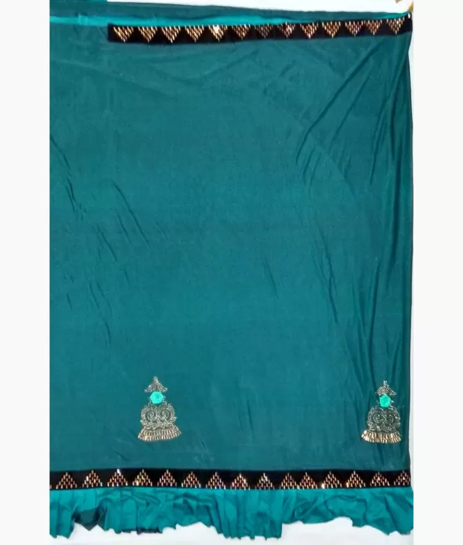 Border is of velvet contrast colour with mirror work. Frill design on panel and pallu of saree. Matching work of saree border is on blouse border patti for neck and sleeves.