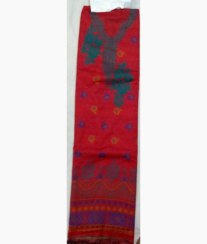 Presenting this amazing woollen suit allured with woven thread work on the whole suit, the woollen suit is paired with plain bottom wear and a shawl. You can even add some light jewellery with the suit to wear to light occasions as it is very warm.