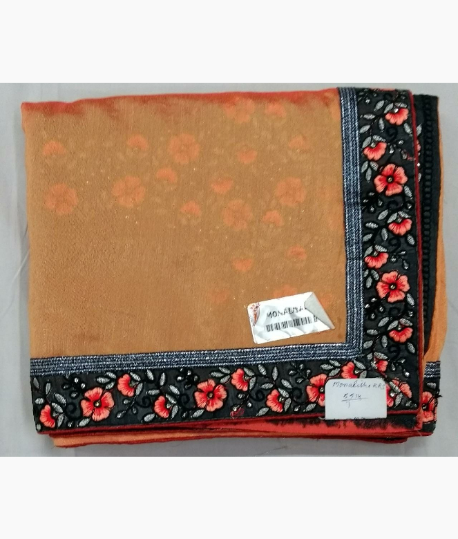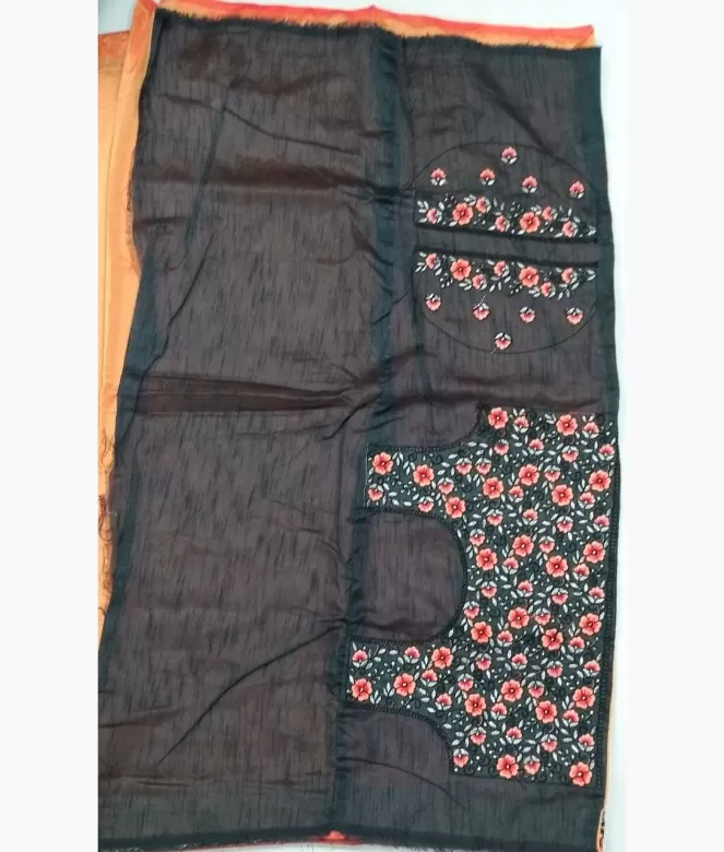 All over plain heavy blouse design saree. Border is of multi colour thread flower and leaf design with silver colour zari in contrast colour.