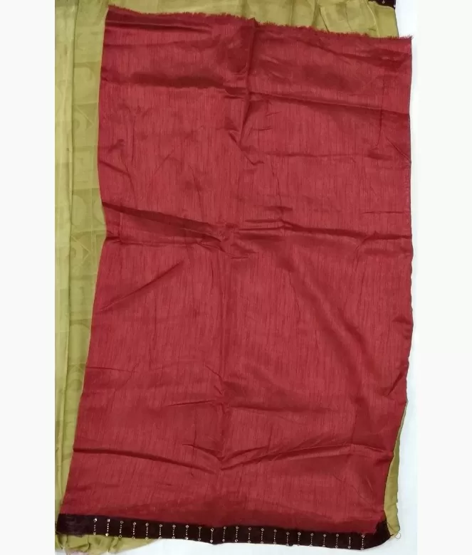 Contrast colour black velvet patti on border with mirror work and sequence work on border patti with frill surrounding all over on saree. Blouse is of dupion silk fabric with matching same border of saree along contrast colour on blouse.