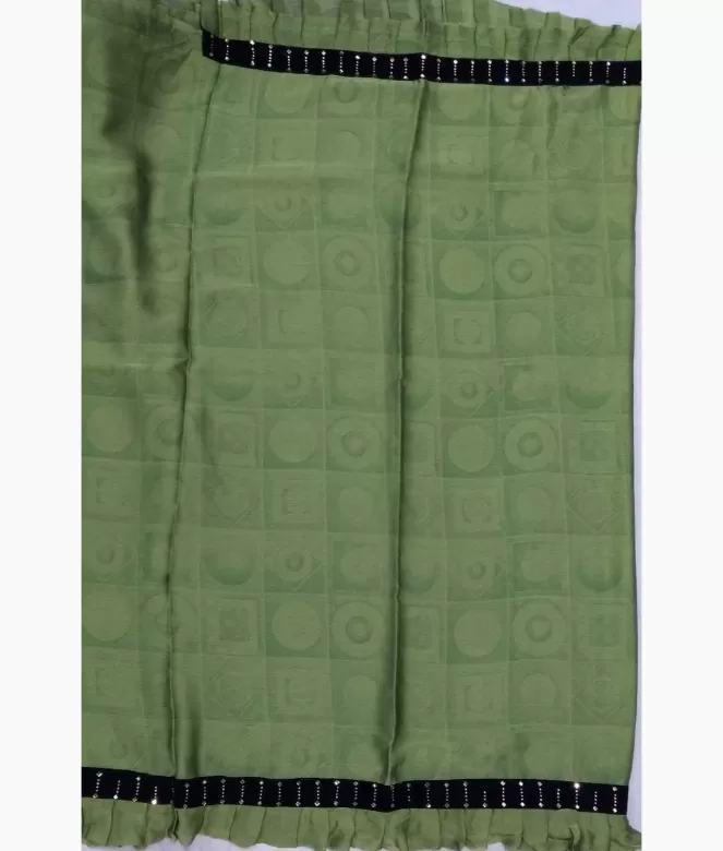 Contrast colour black velvet patti on border with mirror work and sequence work on border patti with frill surrounding all over on saree. Blouse is of dupion silk fabric with matching same border of saree along contrast colour on blouse.