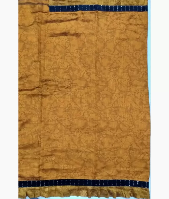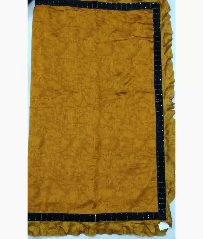 All over self abstract printing on saree with frill design on saree. Border is of contrast colour black velvet patti with mirror and sequence work on border and same fabric frill design on all over saree border.