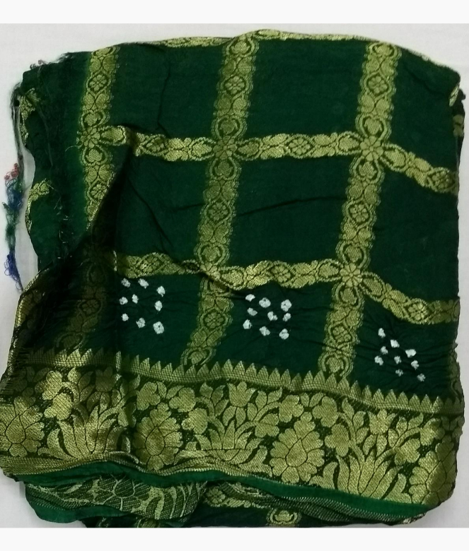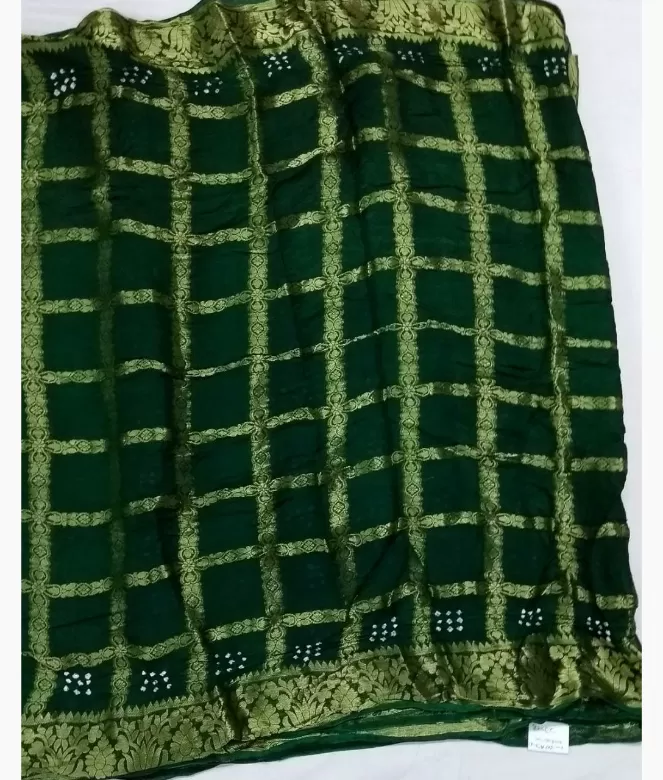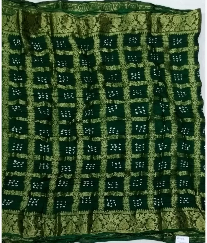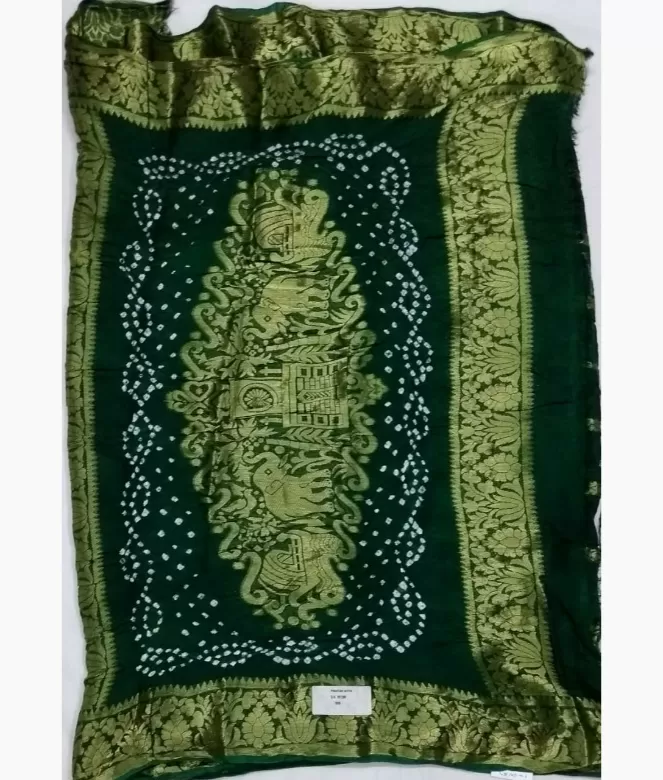 Heavy pallu of zari elephant design with bhandhej. Border is of leaf flower design with golden colour zari on saree. Matching work of saree border is on blouse patti for neck and sleeves.