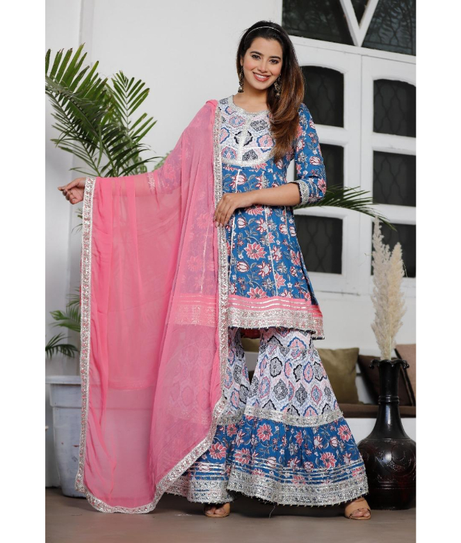 Fabulous Stitched Cotton Blue Sharara Suit Set