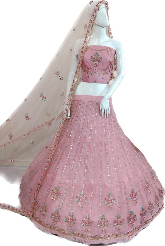 This is a beautiful lehenga choli that features a light pink color and a floral embroidery. This outfit consists of three pieces: a blouse, a skirt and a dupatta . The choli or blouse is made up of a light pink fabric that has gold and pink floral embroidery. The lehenga is made of the same light pink fabric as the choli and it has the same gold and pink floral embroidery all over. Dupatta is made of a sheer pink fabric that has gold and pink floral embroidery on the edges and a gold border.