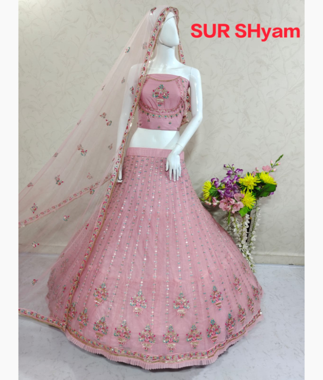 A pink lehenga in net fabric with resham embroidery and a heavy dupatta would be a stunning and fashionable choice. Net fabric is known for its sheer and delicate appearance, which adds an element of elegance and femininity to the outfit. When combined with resham embroidery, the lehenga will have a beautiful texture and intricate designs. Here's how this outfit could look: Pink Lehenga in Net Fabric: The lehenga can be in a beautiful shade of pink, which complements various skin tones and is a popular choice for weddings and other festive occasions. Net fabric will create a flowing and ethereal look, and the pink color will add a touch of romance and charm. Resham Embroidery: Resham is a type of silk thread that is commonly used for embroidery work. The intricate resham embroidery on the lehenga can feature traditional motifs or contemporary patterns, depending on your preferences. This embroidery will add a touch of opulence and sophistication to the overall look. Heavy Dupatta: The heavy dupatta can be in a contrasting or matching color, depending on your style preference. It can be made of a luxurious fabric like silk or velvet, featuring ornate borders, sequins, or additional embroidery work. The heavy dupatta will drape gracefully over the shoulders and can be styled in various ways to complement the lehenga. Blouse (Choli): The choli or blouse can be designed to complement the lehenga's embroidery and style. It can be in a matching color with minimal embellishments or mirror work to let the lehenga shine or have some resham embroidery to coordinate with the lehenga's design. Accessories: When wearing a pink lehenga with resham embroidery and a heavy dupatta, you can pair it with traditional gold or silver jewelry to complete the look. Kundan, polki, or jadau sets would look fantastic with this outfit. Choose statement earrings, a necklace, bangles, and a maang tikka to elevate your overall appearance. Hairstyle and Makeup: Your hairstyle and makeup should complement the traditional and festive nature of the outfit. Classic hairstyles like a bun with gajra (flower garland) or loose curls with hair accessories would suit the look. For makeup, consider opting for a soft and glowing look with emphasis on the eyes and a matching lip color. Remember that fashion trends may change over time, so it's a good idea to consult with a professional designer to ensure you get the perfect pink net lehenga with resham embroidery and a heavy dupatta that suits your personal style and preferences.