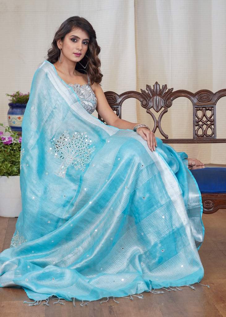 A pure tissue linen saree with hand embroidery and cutwork is a stunning piece that exudes elegance and craftsmanship.