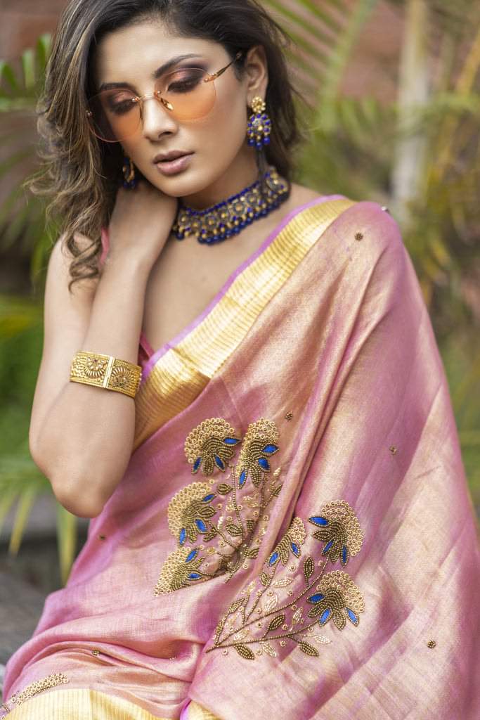 A pure tissue linen saree with hand embroidery and cutwork is a stunning piece that exudes elegance and craftsmanship.