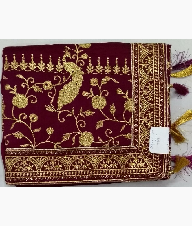 Beautiful Peacock design thread and jari with sequence work on all over saree. Fine jari and sequence work on border pallu with latkan on saree makes it beautiful. Matching work of saree is on blouse for neck and sleeves.