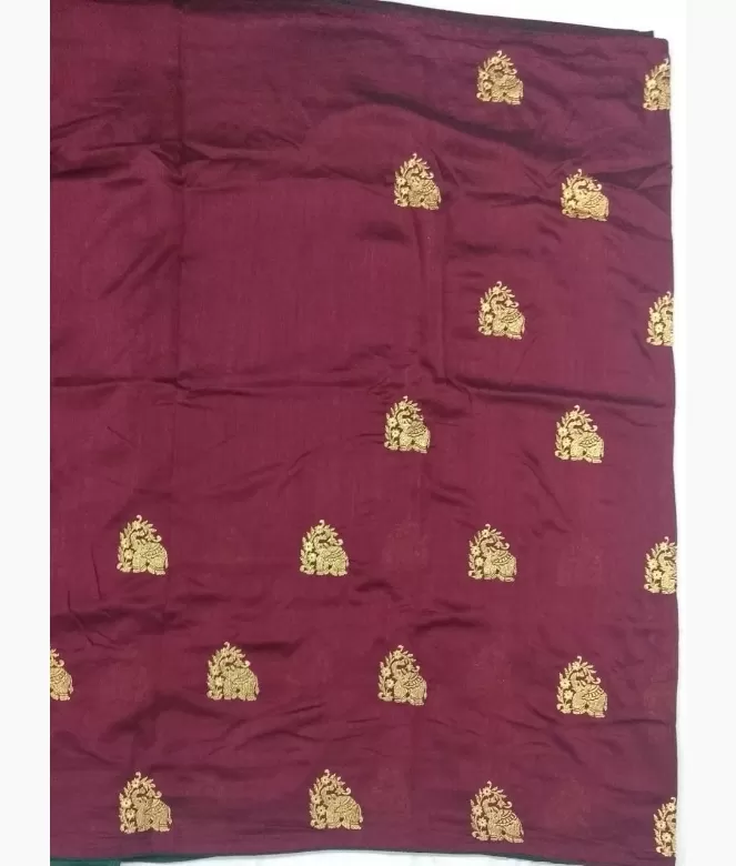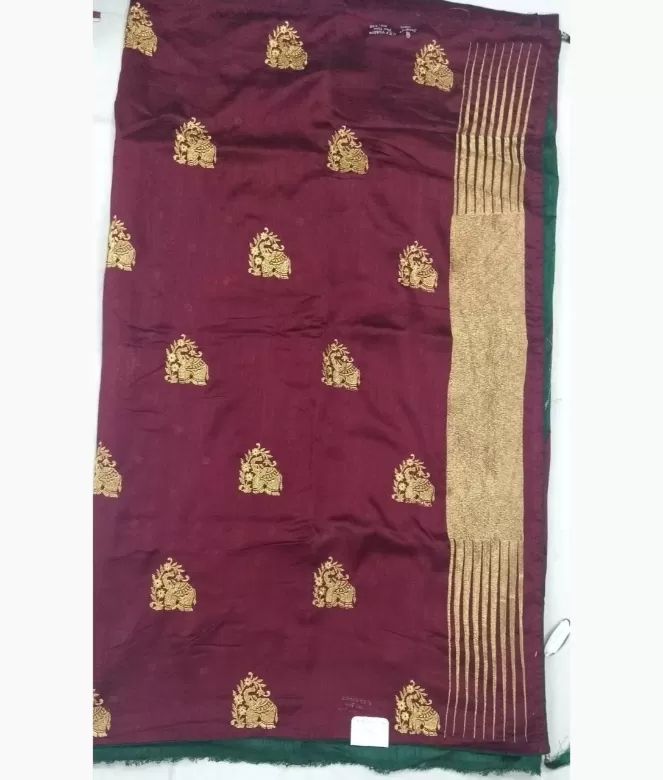 All over golden colour tree with elephant design booty on saree. zari work on tree with elephant booty.