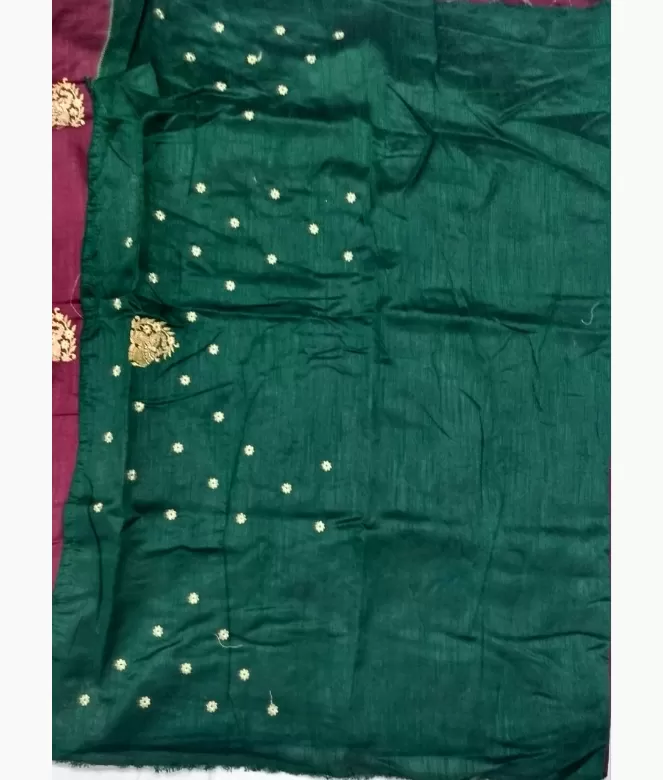 Heavy pallu zari stripes with booty on saree with two side corners latkan small piping border along with contrast colour piping on saree. Blouse is of contrast colour with zari work and matching same work of saree for neck and sleeves.