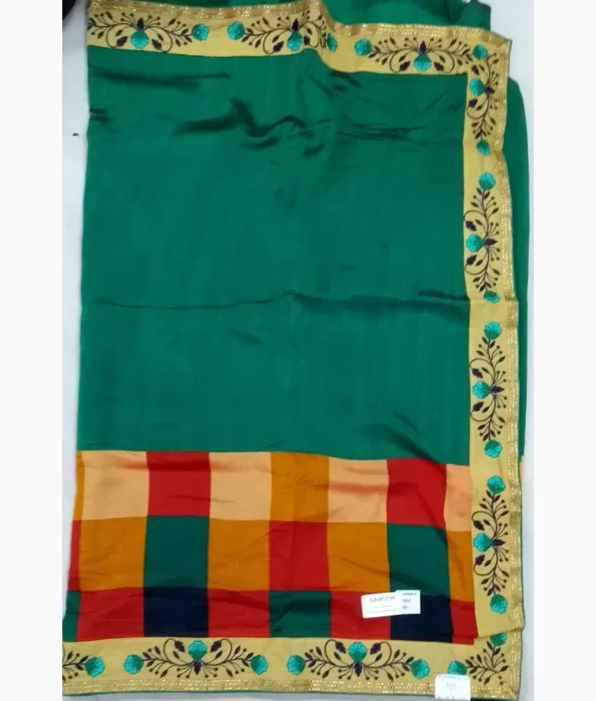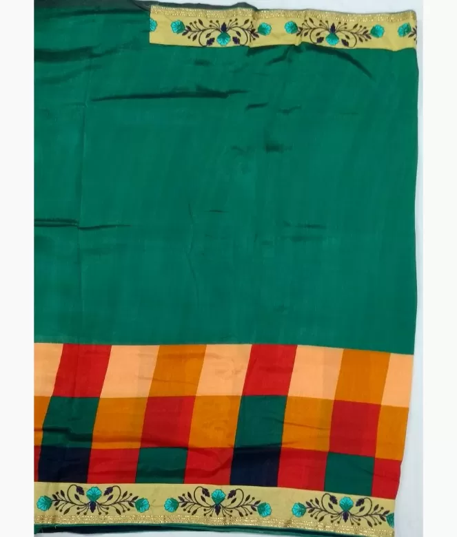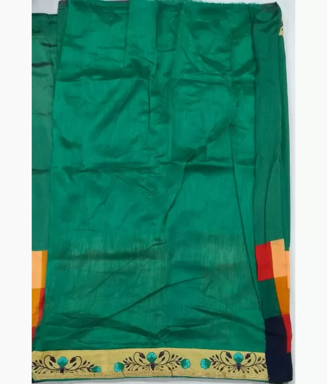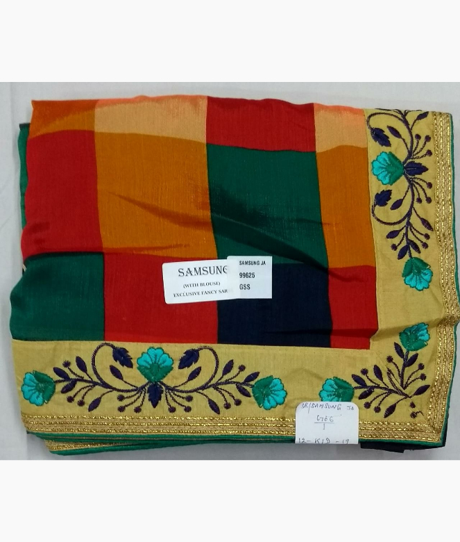Border is of contrast colour Patti with multi colour flower and leaf ambi on Patti with golden colour zari strips on saree. Matching same border of saree is on blouse Patti for neck and sleeves.