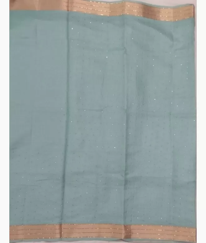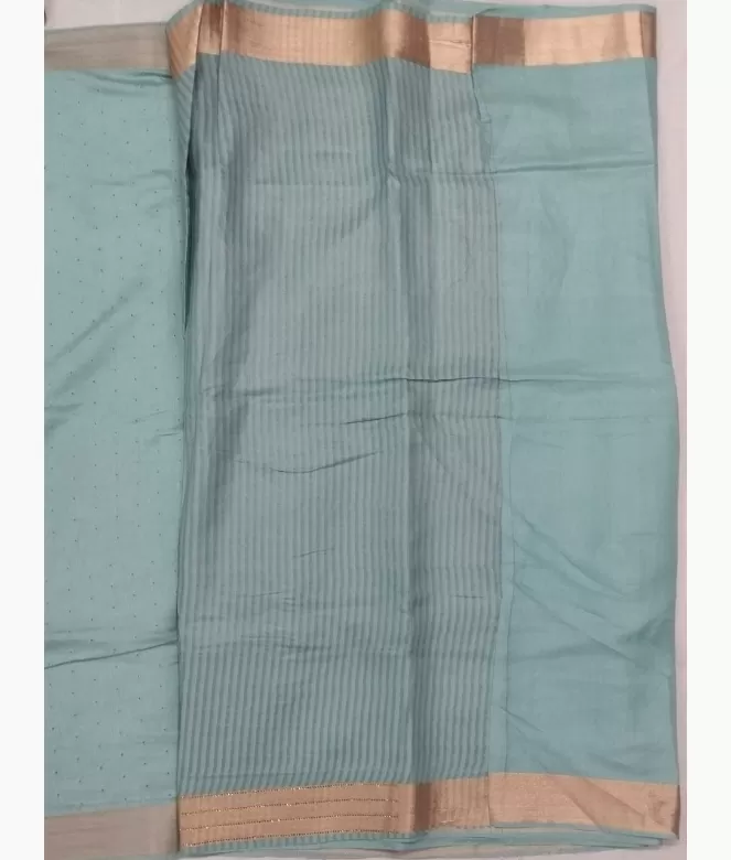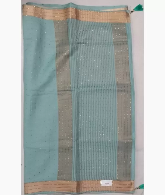 Border design is of golden colour jari with sequence work on all over saree. Fine jari and saros ki work with stripe design on pallu. Matching work of saree pallu is on blouse with border patti for neck and sleeves.