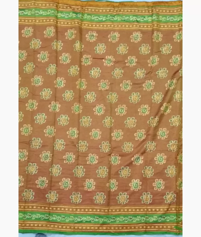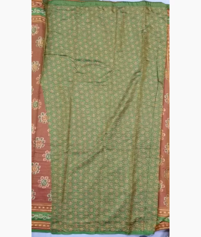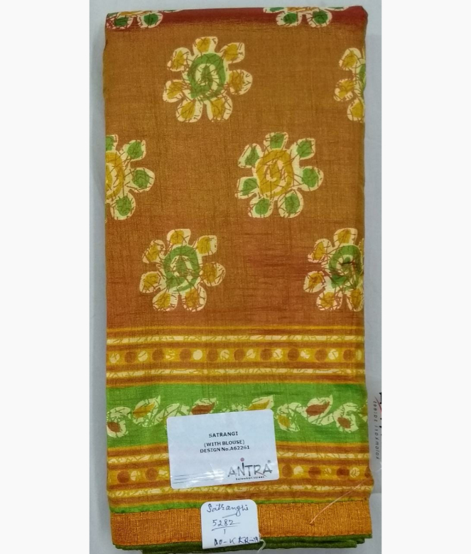 Border is of same colour piping with contrast colour leaf design Patti. Matching printed blouse with contrast colour for back, neck and sleeves.