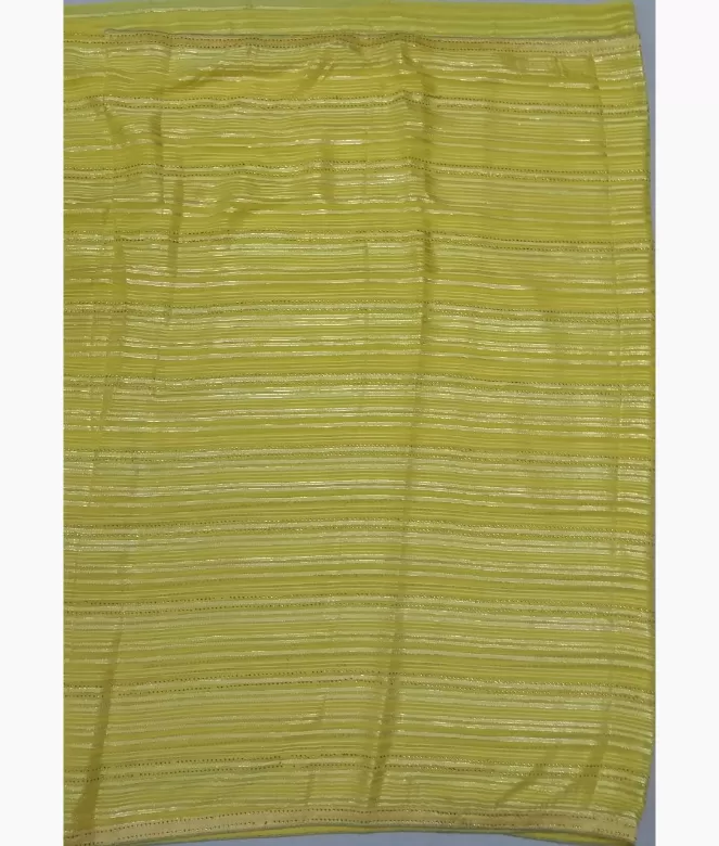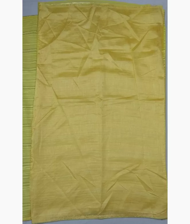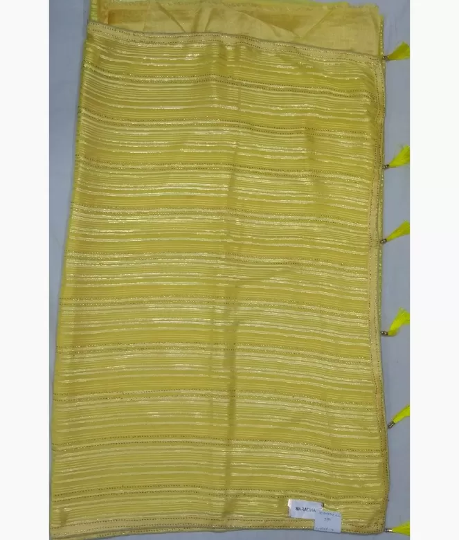 Sequence work outline on strips on all over saree. Saree with latkan on pallu. Border is of sequence work with piping. blouse is of row silk fabric with matching same border of saree.