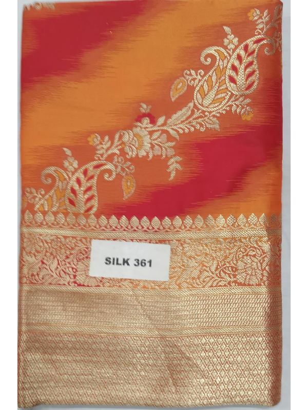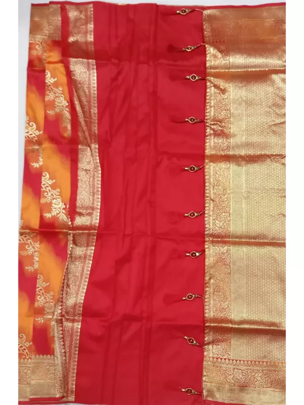 All over golden Zari weaving work on saree. Two shaded silk Zari on saree heavy pallu of Zari with latkan. Border is of leaf design with Zari work. Blouse is of matching saree border patti for neck and sleeves.