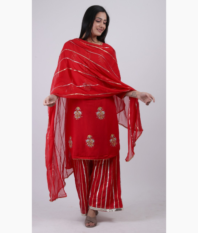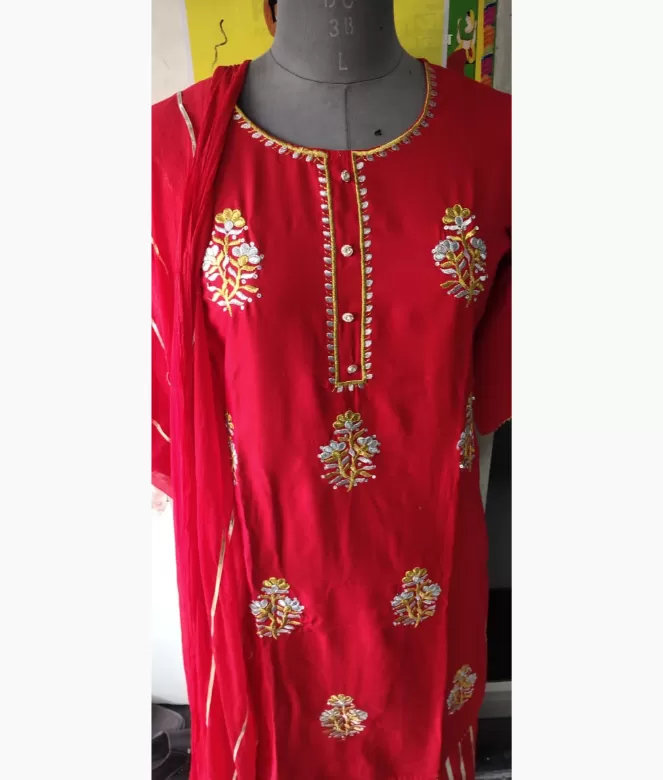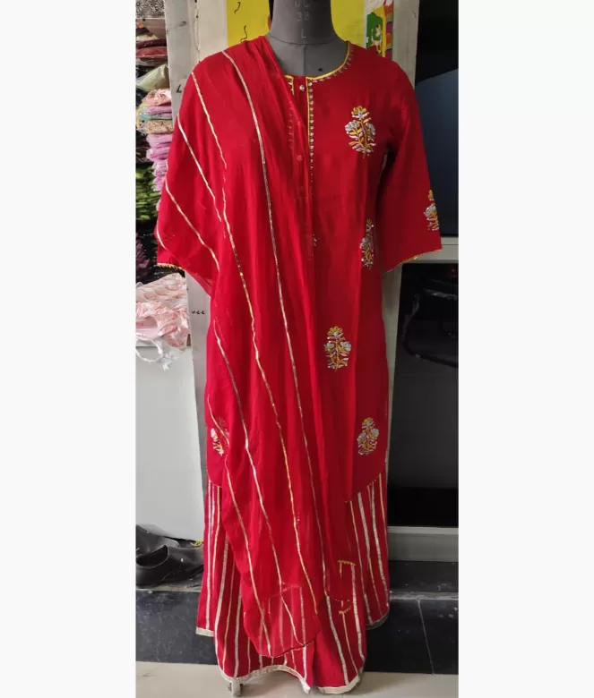 Beautiful rayon embroidery kurti with gota lace and rayon palazzo with chiffon dupatta.