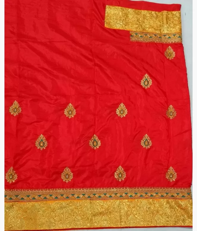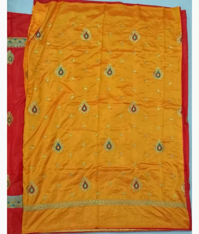 Double border with multi colour thread and golden colour weaving with latkan on pallu. Blouse is of contrast colour with matching work of saree for neck and sleeves.