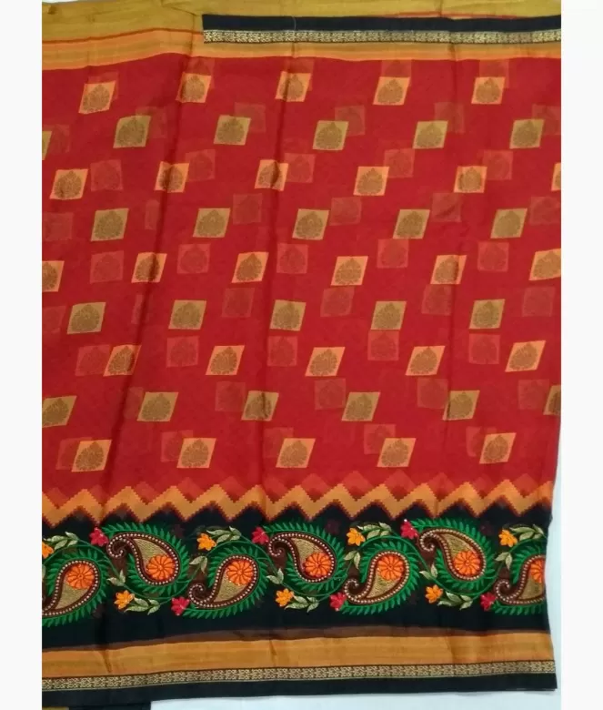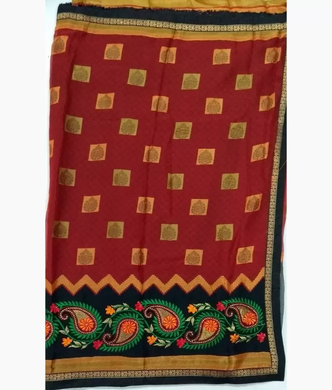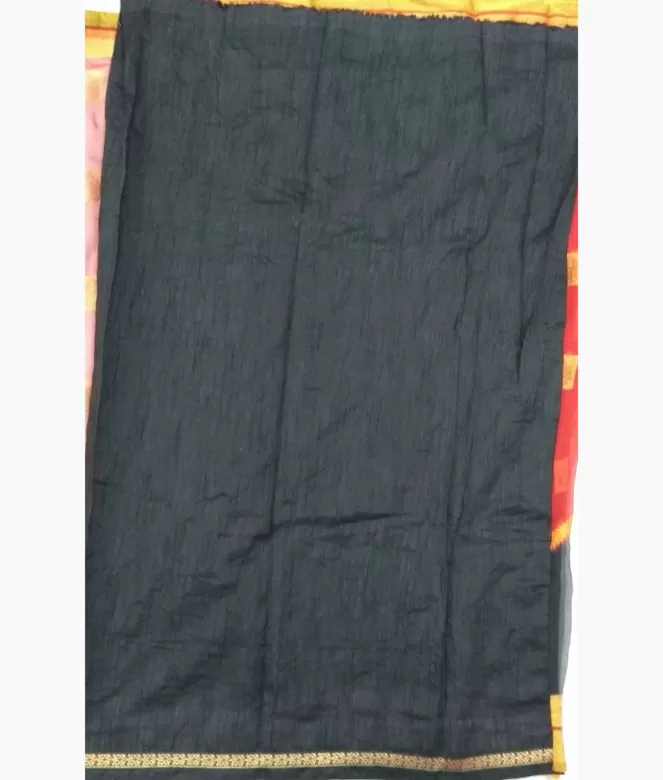 Border is of golden colour zari gota with black colour piping on saree. Blouse is of row silk fabric with matching same small border of saree.