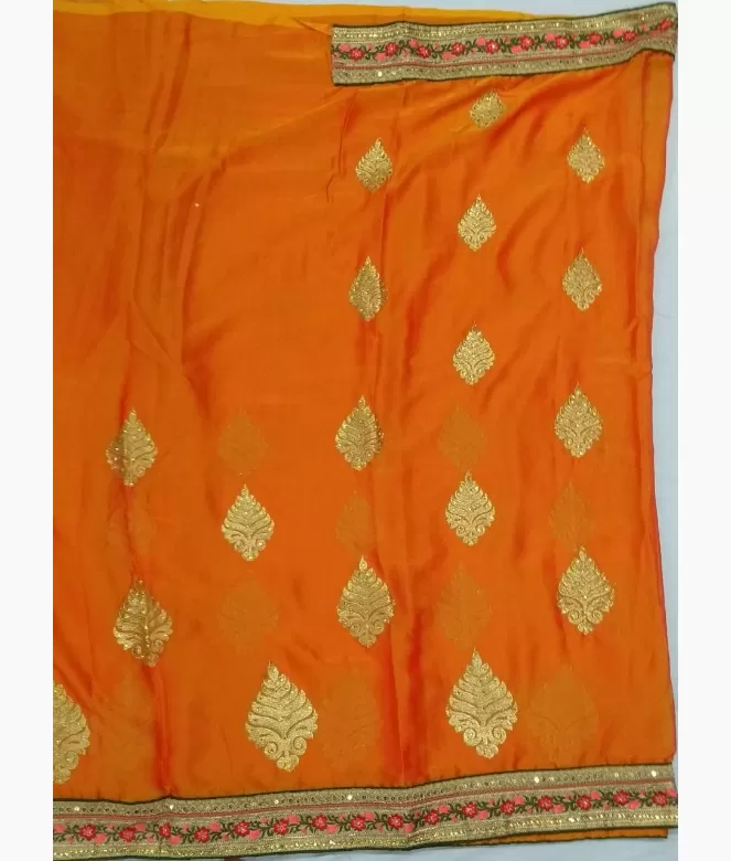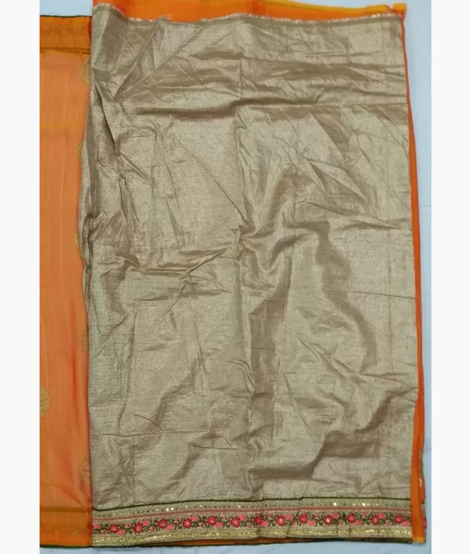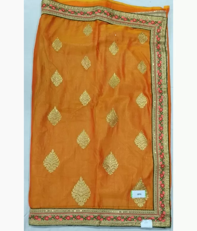Border is of leaf and flower design with multi colour thread and sequence work with surrounding piping on all over saree. Blouse is of golden colour skimmer fabric with matching same border of saree for neck and sleeves.