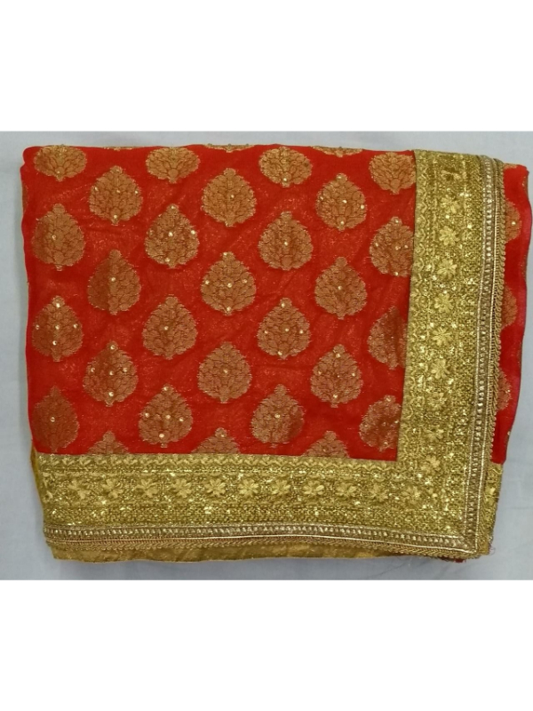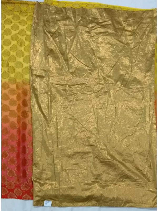 Shaded yellow, orange and red colour on shoulder of saree. Border design is of Zari and sequence work on saree blouse is of shimmer fabric with matching same border patti of saree for neck and sleeves.