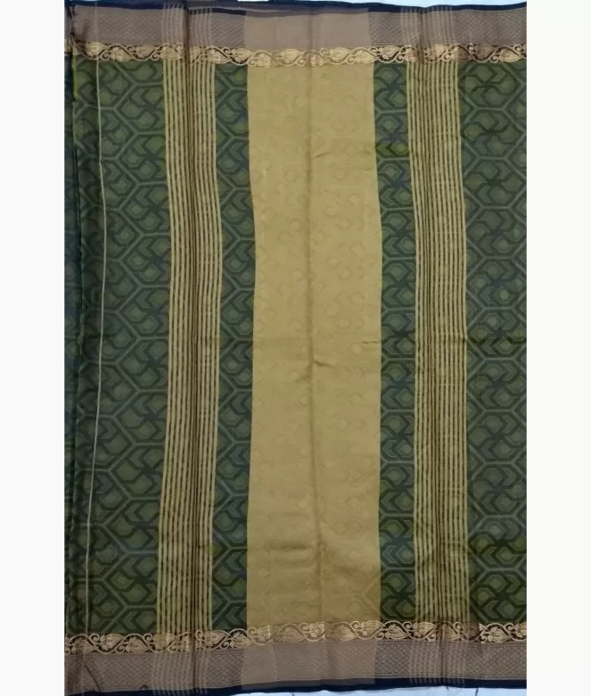 Border is of leaf design in golden colour zari work with light golden colour rhombus design jaal heavy double design border on saree. Blouse is of emboss strips jaal with matching same work of saree with same border patti for back, neck and sleeves.