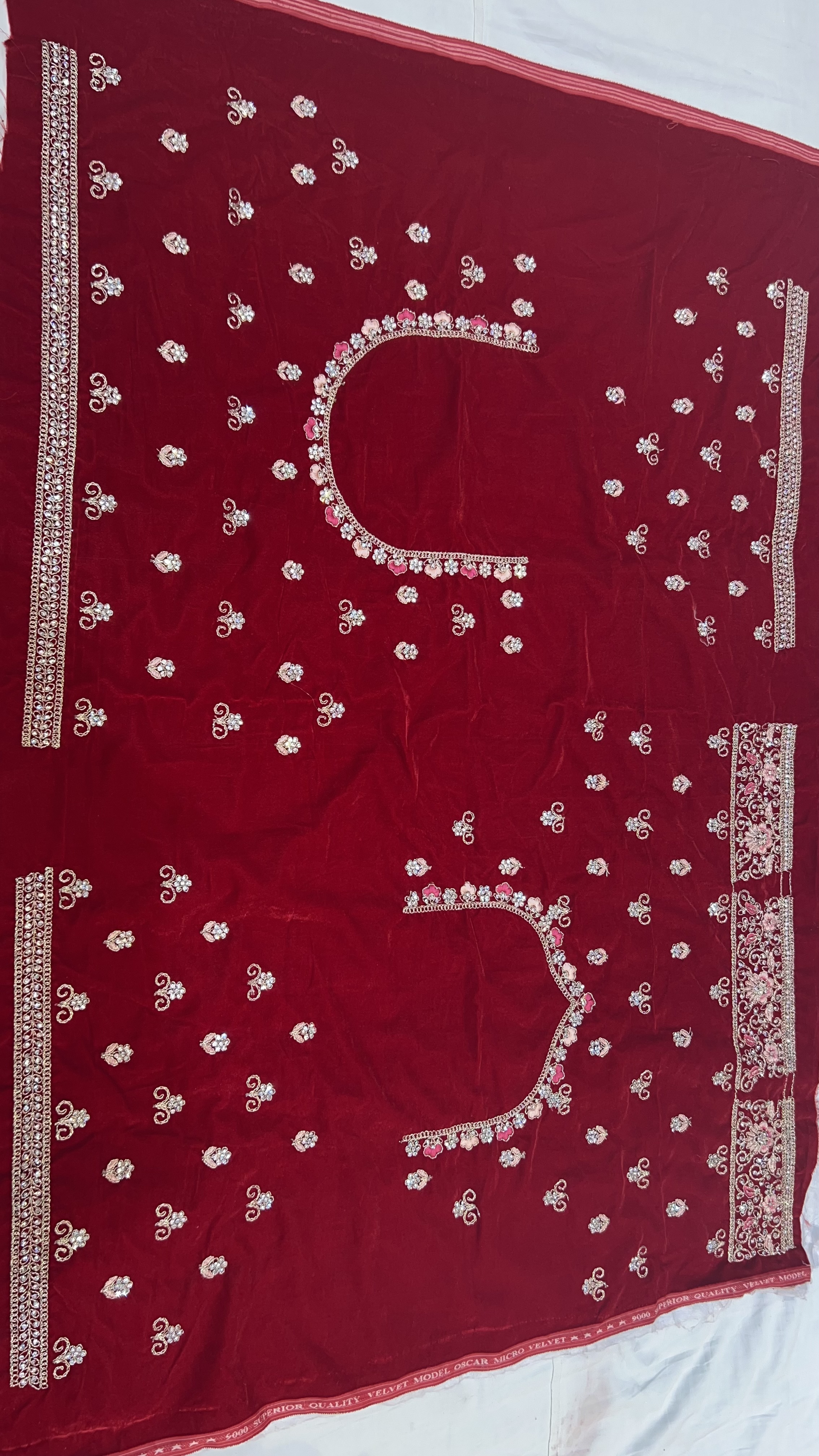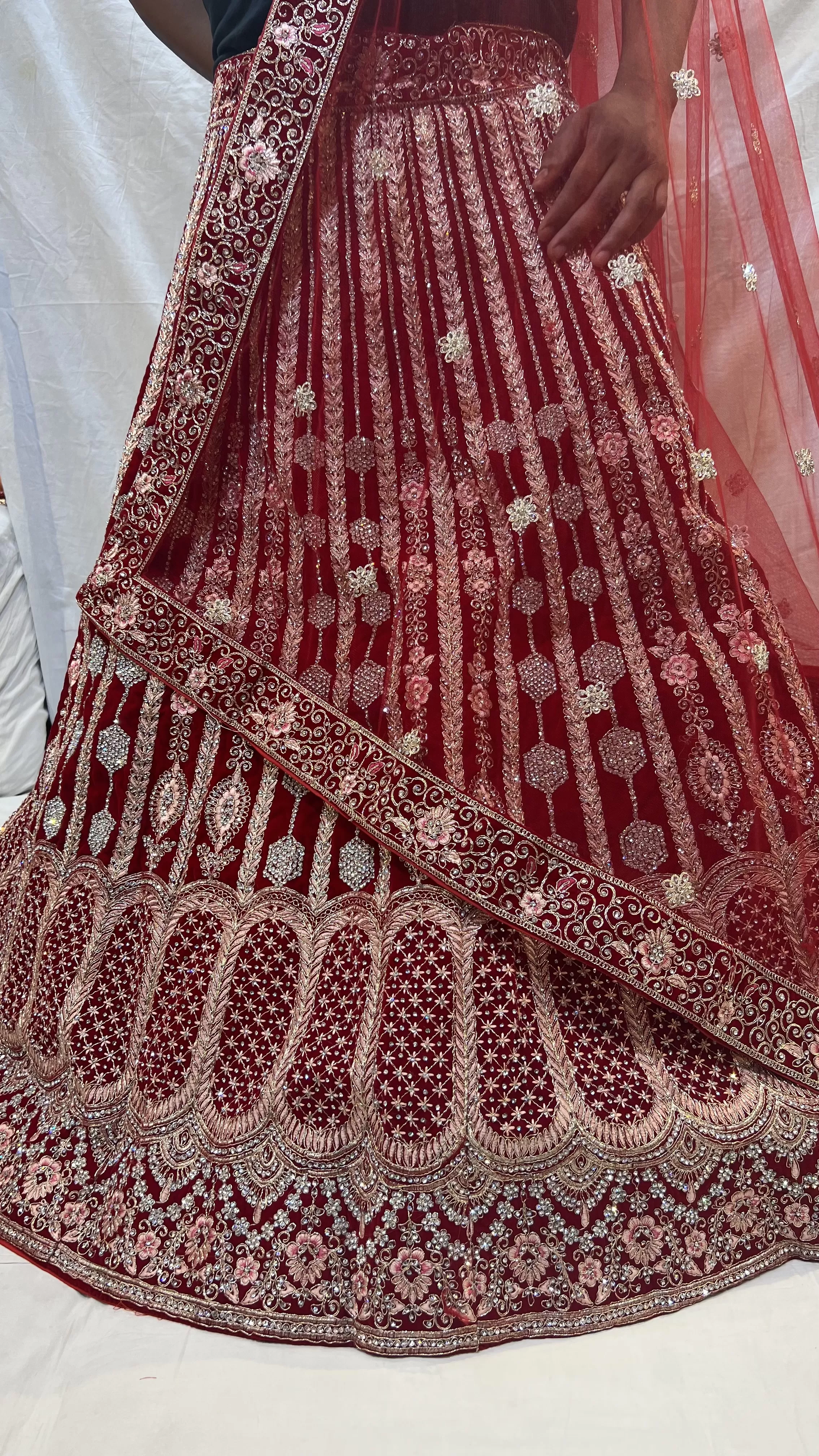A beautiful lehenga for the bride to rock your look. You can pair the dress with golden jewelry to complete your appearance. The design is engraved on Micro Velvet Fabric which gives it a unique look.