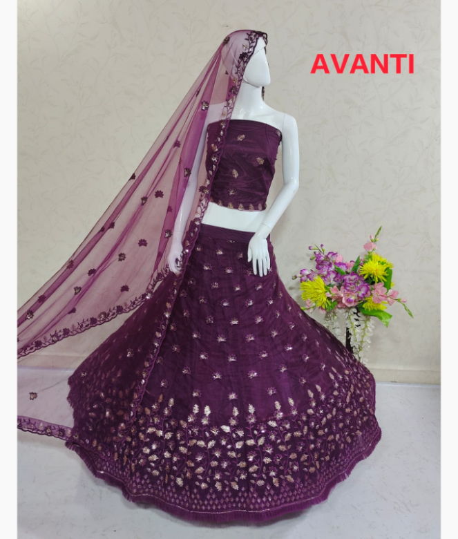 A wine color lehenga with the work of rose gold sequins and resham embroidery in heavy flair would be an opulent and glamorous choice. The rich and deep wine color combined with the shimmer of rose gold sequins will create a luxurious and sophisticated look. Let's explore the elements of this exquisite outfit: Wine Color Lehenga: Wine is a deep and elegant color that exudes richness and warmth. It is a beautiful choice for special occasions and adds a touch of luxury to any outfit. The lehenga can be crafted from luxurious fabrics like silk or velvet to enhance its regal appeal. Rose Gold Sequins: Rose gold sequins will add a touch of sparkle and glamour to the lehenga. The sequins can be scattered all over the lehenga or concentrated in specific areas to create a beautiful play of light and texture. Resham Embroidery: The resham embroidery can complement the sequins and add intricate and artistic details to the lehenga. The combination of sequins and resham will create a mesmerizing contrast and make the embroidery stand out. Heavy Flair: A heavy flair in the lehenga will give it a majestic and grand look. The flared silhouette will create a beautiful twirl effect when you move, making the lehenga even more captivating. Blouse (Choli): The choli or blouse can be designed to complement the embroidery and color of the lehenga. It can be kept simple with sequins and resham work matching the lehenga or feature a unique design to add interest to the overall look. Dupatta: Pair the lehenga with a matching or contrasting dupatta that complements the wine color and the embroidery. The dupatta can have a border with sequins and resham work to tie the whole outfit together. Accessories: To accessorize this glamorous lehenga, you can opt for rose gold or gold jewelry to match the sequins. Statement earrings, a necklace, bangles, and a maang tikka with intricate designs will add to the opulence of the outfit. Hairstyle and Makeup: For the hairstyle, you can choose a classic updo, soft curls, or a braided hairstyle adorned with hair accessories to complement the lehenga's grandeur. For makeup, a bold and radiant look with defined eyes and a deep wine lip color will complement the overall theme. Creating a wine color lehenga with rose gold sequins and resham embroidery in heavy flair requires the expertise of skilled artisans and designers who can bring your vision to life. Working with professionals will ensure that the final outfit is a work of art, reflecting your personality and style while highlighting the beauty of the wine color lehenga with its shimmering sequins and intricate embroidery.